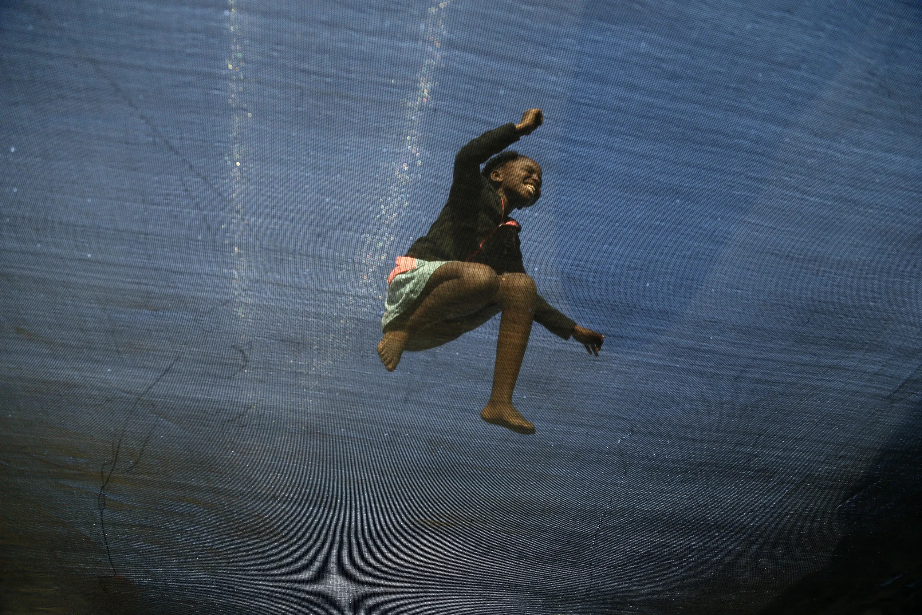 Twelve year-old girl Simphiwe Gama enjoys jumping on a trampoline in Katlehong, about 30Km east of Johannesburg, South Africa, Monday, July 13, 2015. The trampoline is set up by a resident and operated for the local community, charging 50 cents for five minutes of jumping fun. (Photo by Themba Hadebe/AP Photo)