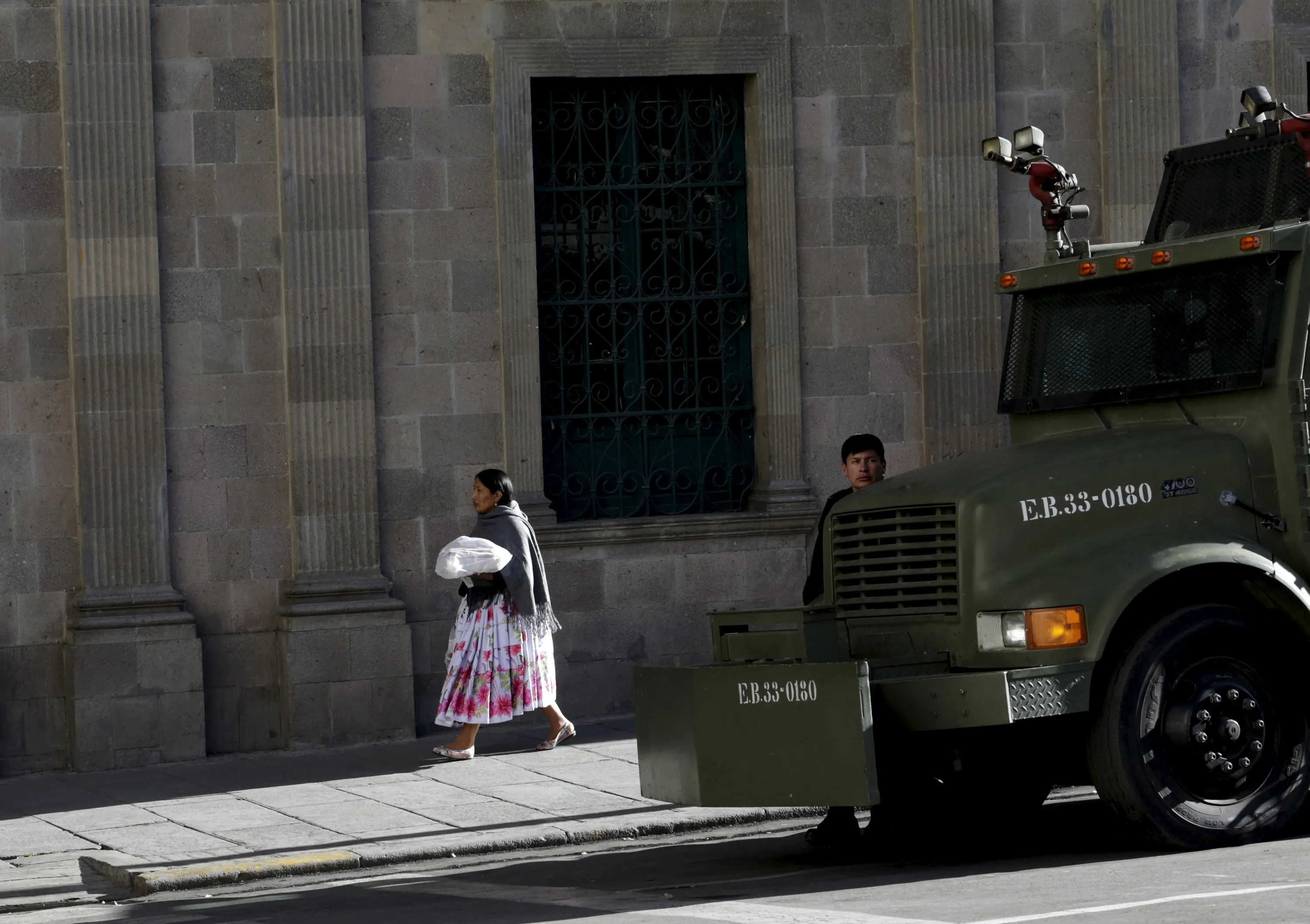 A woman walks in front of Bolivia's presidential palace as a riot police truck is seen in La Paz, July 20, 2015. (Photo by David Mercado/Reuters)