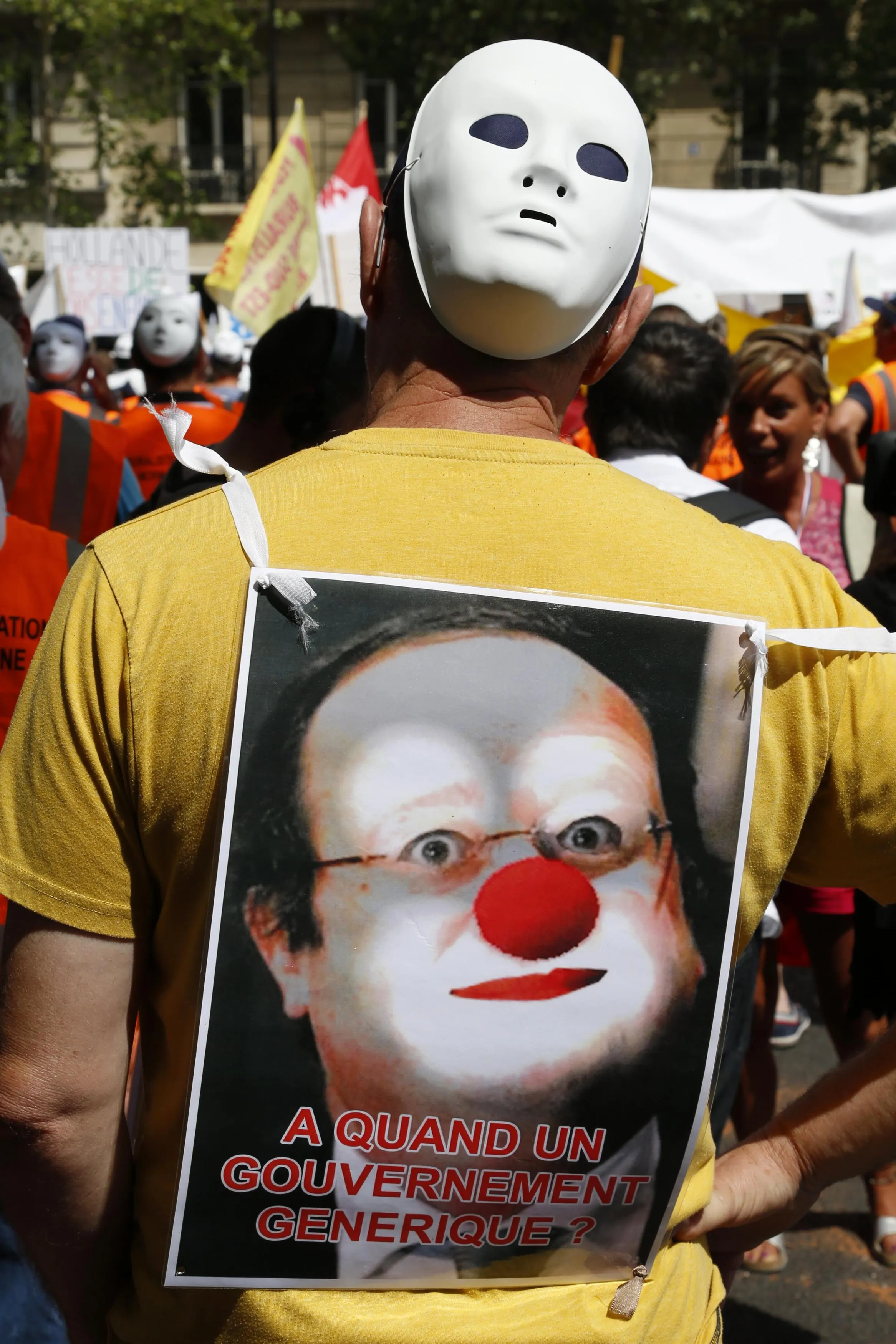 A demonstrating French tobacconist wears a placard with an image of France's President Hollande that reads, “When we will have a generic government” as he attends a protest march in Paris, France, July 22, 2015. France's tobacconists are protesting plans to force cigarette companies to use plain, unbranded packaging, as part of anti-smoking legislation. (Photo by John Schults/Reuters)