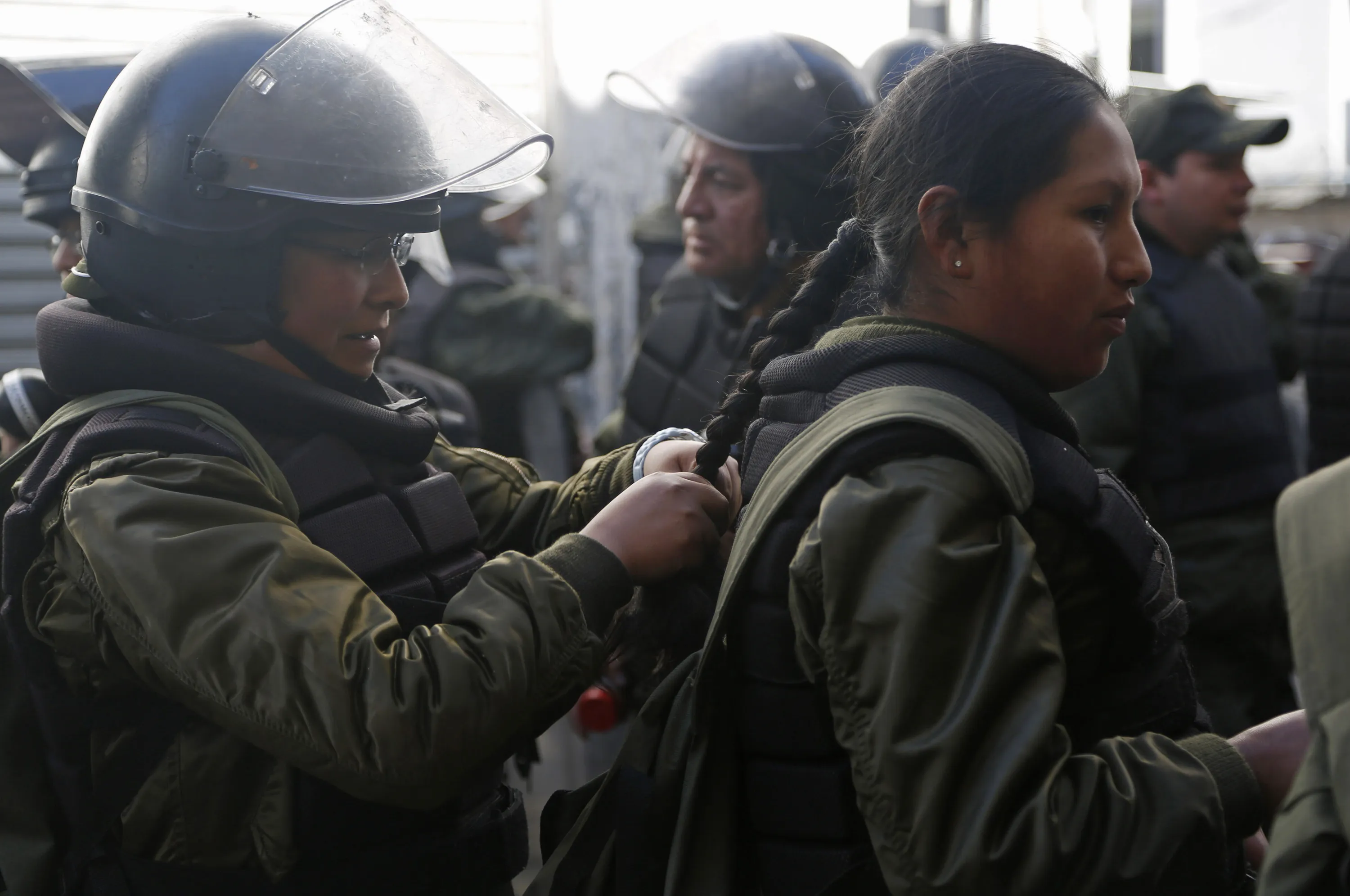 Women police in full riot gear braid each others hair before clashes with protesting miners from Bolivia's Potosi region, in La Paz, Bolivia, Wednesday, July 22, 2015. (Photo by Juan Karita/AP Photo)