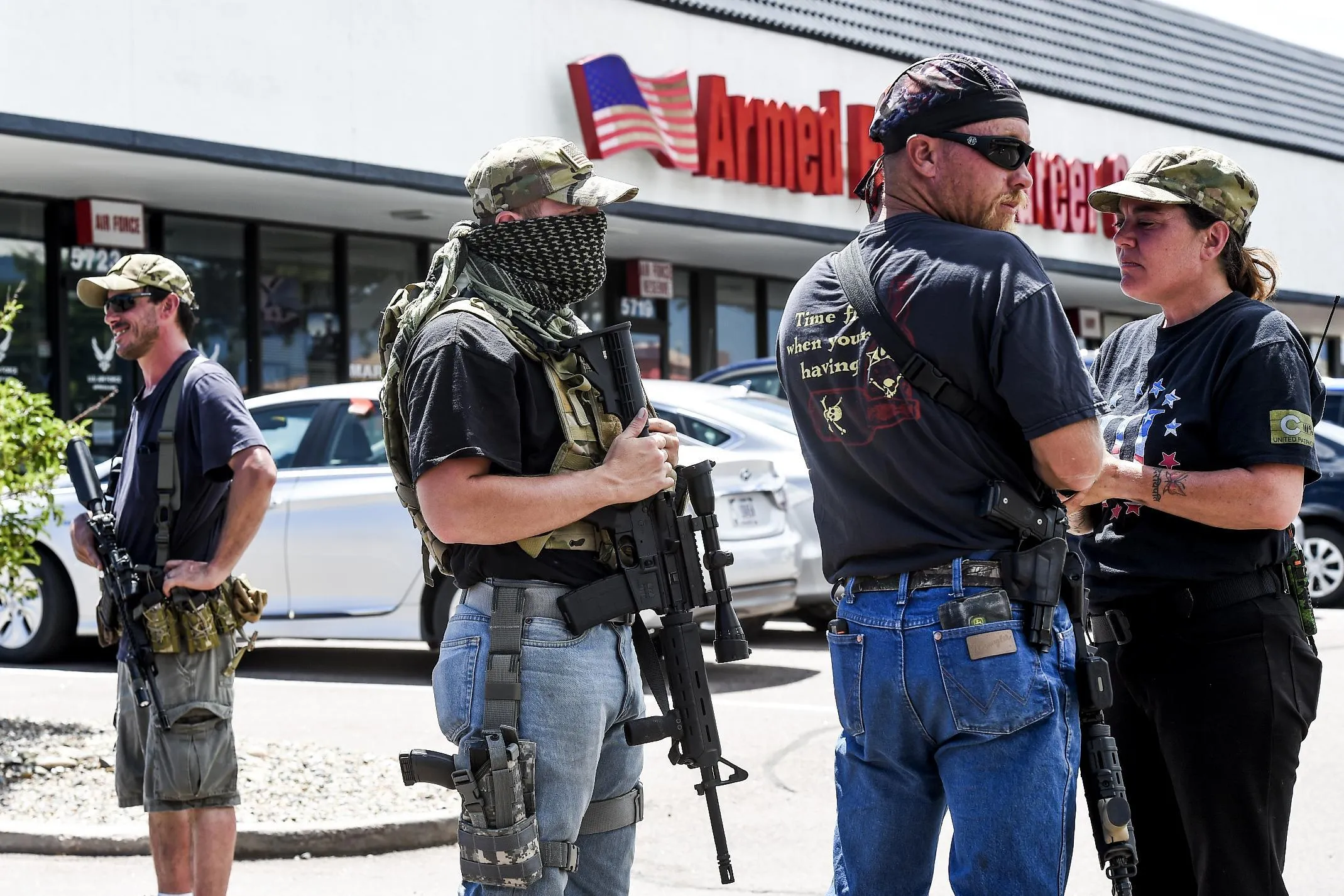 A small group of armed citizens stand guard outside a Colorado Springs, Colo., Armed Forces Career Center Wednesday, July 22, 2015. Gun-toting citizens are showing up at military recruiting centers around the country, saying they plan to protect recruiters following last week's killing of four Marines and a sailor in Chattanooga, Tenn. (Photo by Michael Ciaglo/The Gazette via AP Photo)