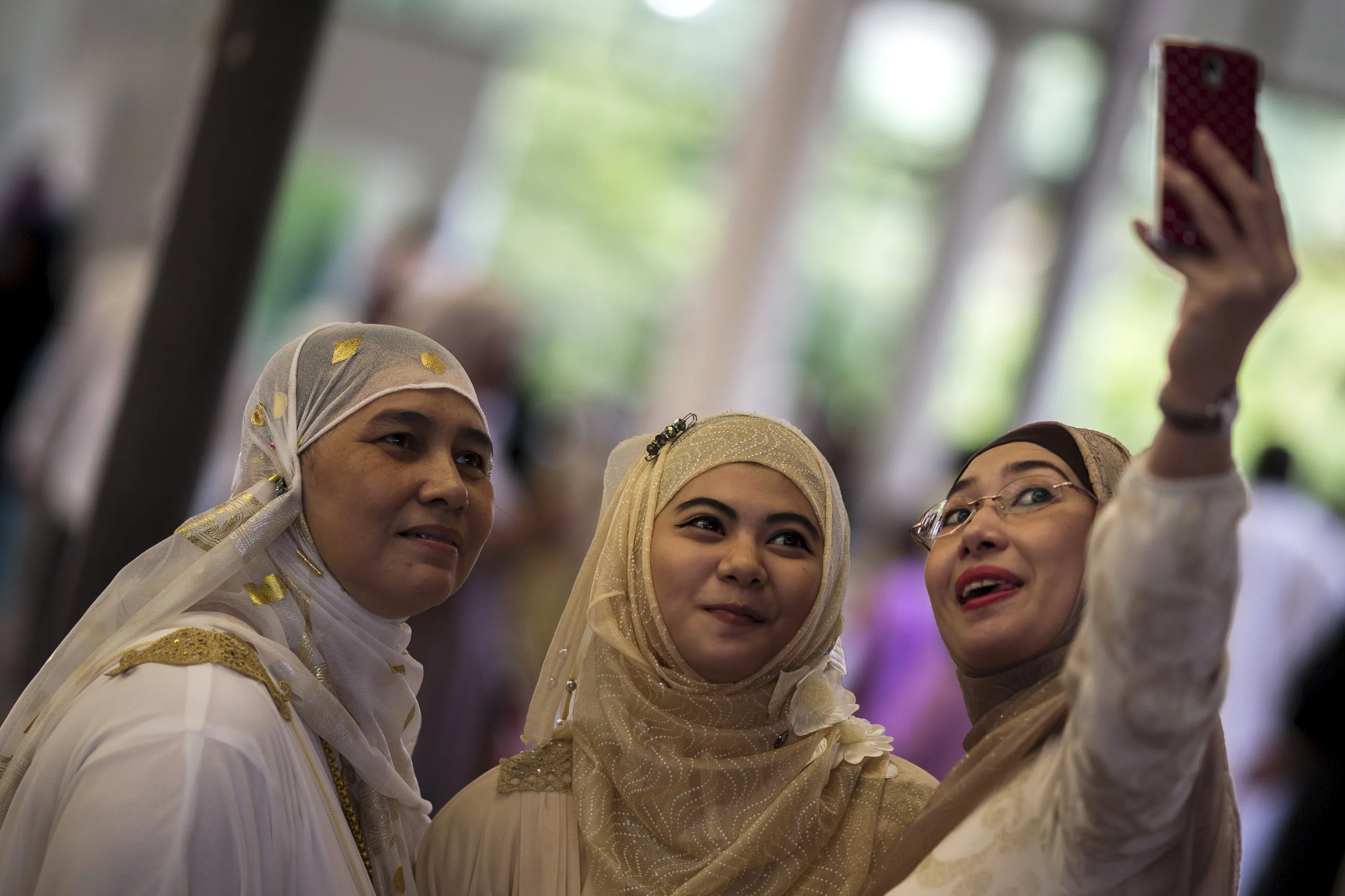 Thai Muslim women take a selfie after they attend a mass prayer during Eid al-Fitr celebrations at a mosque in Bangkok, Thailand, July 17, 2015. (Photo by Athit Perawongmetha/Reuters)