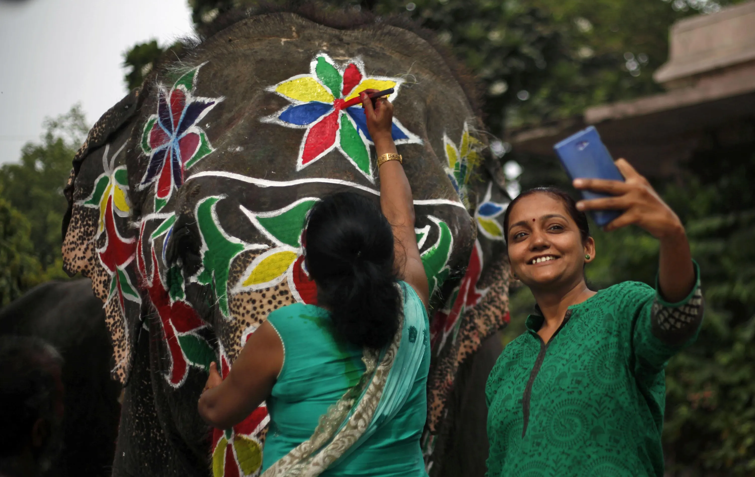 An Indian woman take a selfie with a decorative elephant as another woman paints it on the eve of the annual Rath Yatra, or Chariot procession in Ahmadabad, India, Friday, July 17, 2015. Amid tight security arrangements, devotees will seek blessings during the chariot procession of Lord Jagannath, scheduled to begin Saturday. (Photo by Ajit Solanki/AP Photo)