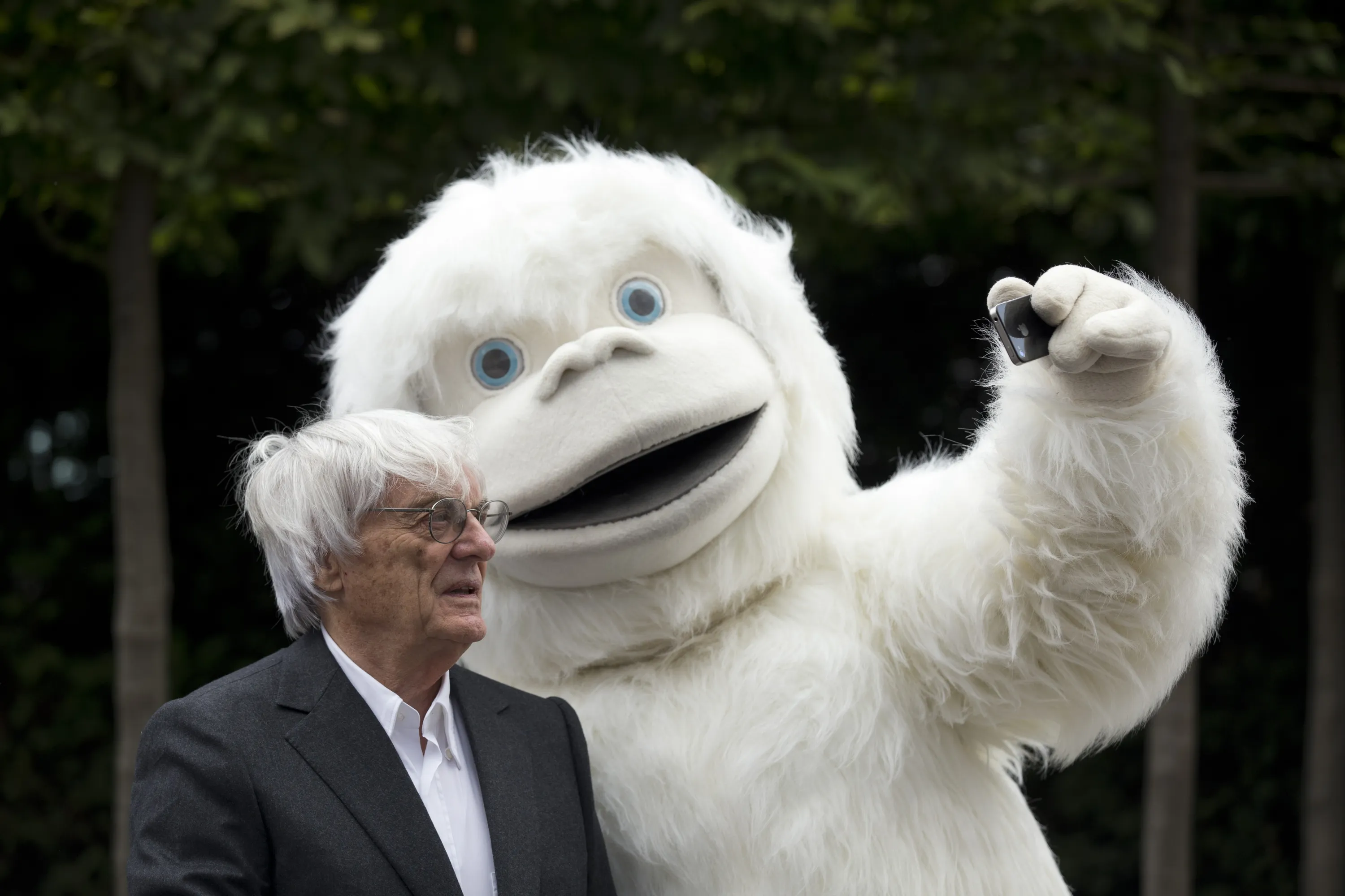 Formula One boss Bernie Ecclestone has a selfie taken with a person dressed in a Yeti costume during a photocall to promote the Mongol Rally outside the headquarters of Formula One Group in London, Thursday, July 16, 2015. (Зрщещ ин Matt Dunham/AP Photo)
