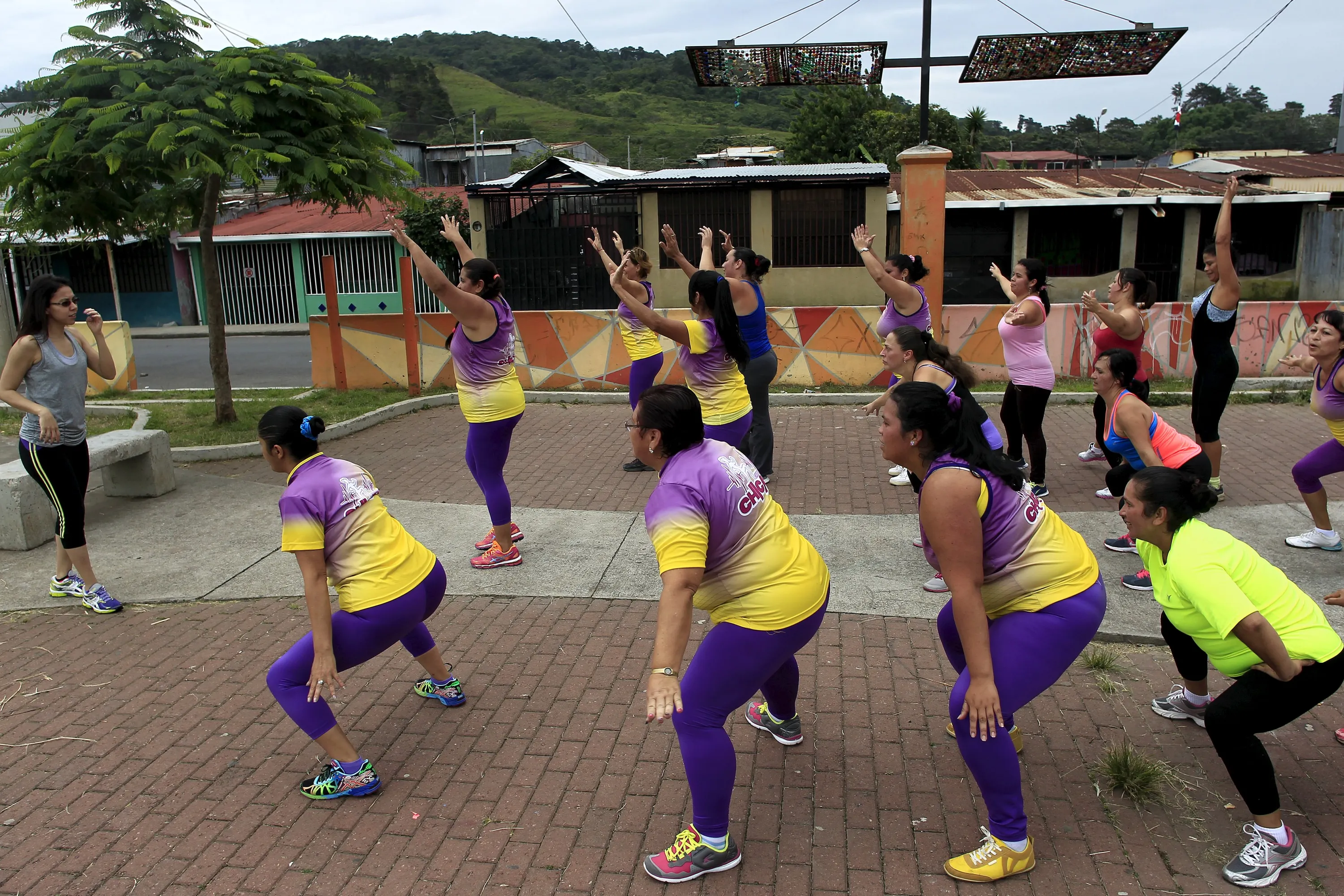 Andrea Abarca, (L) leads an aerobics class in Los Guidos de Desamparados, Costa Rica July 23, 2015. More than 300 women participated in a physical health program organized by Abarca, which aims to combat obesity and sedentary behavior in poor women living in a slum. The National Nutrition Survey shows that the Costa Rican population has 62.4 percent of adult men who are obese, while among women the percentage was 77.3, according to local media. (Photo by Juan Carlos Ulate/Reuters)