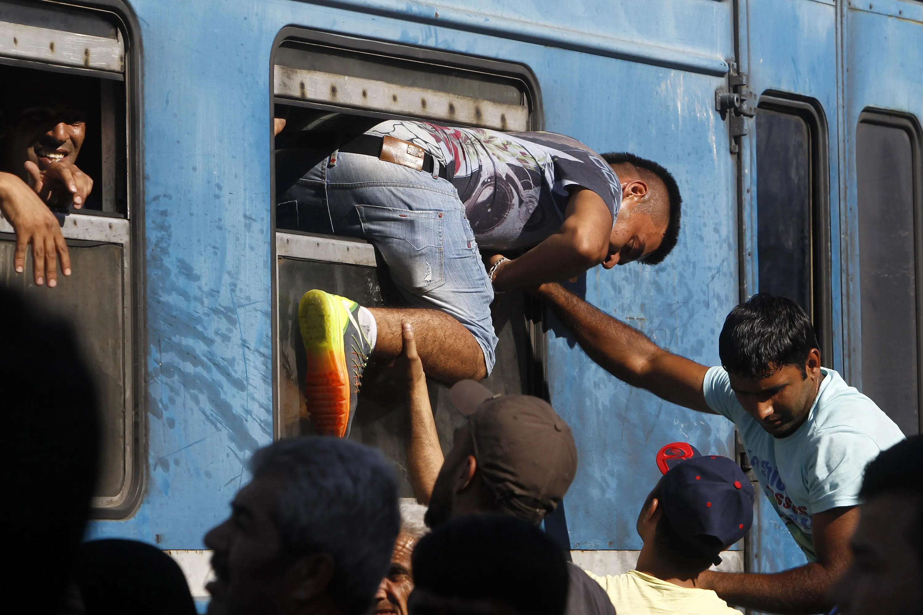 In this photo taken on Thursday, July 23, 2015 a migrant enters a train through a window at the railway station in the southern Macedonian town of Gevgelija. (Photo by Boris Grdanoski/AP Photo)
