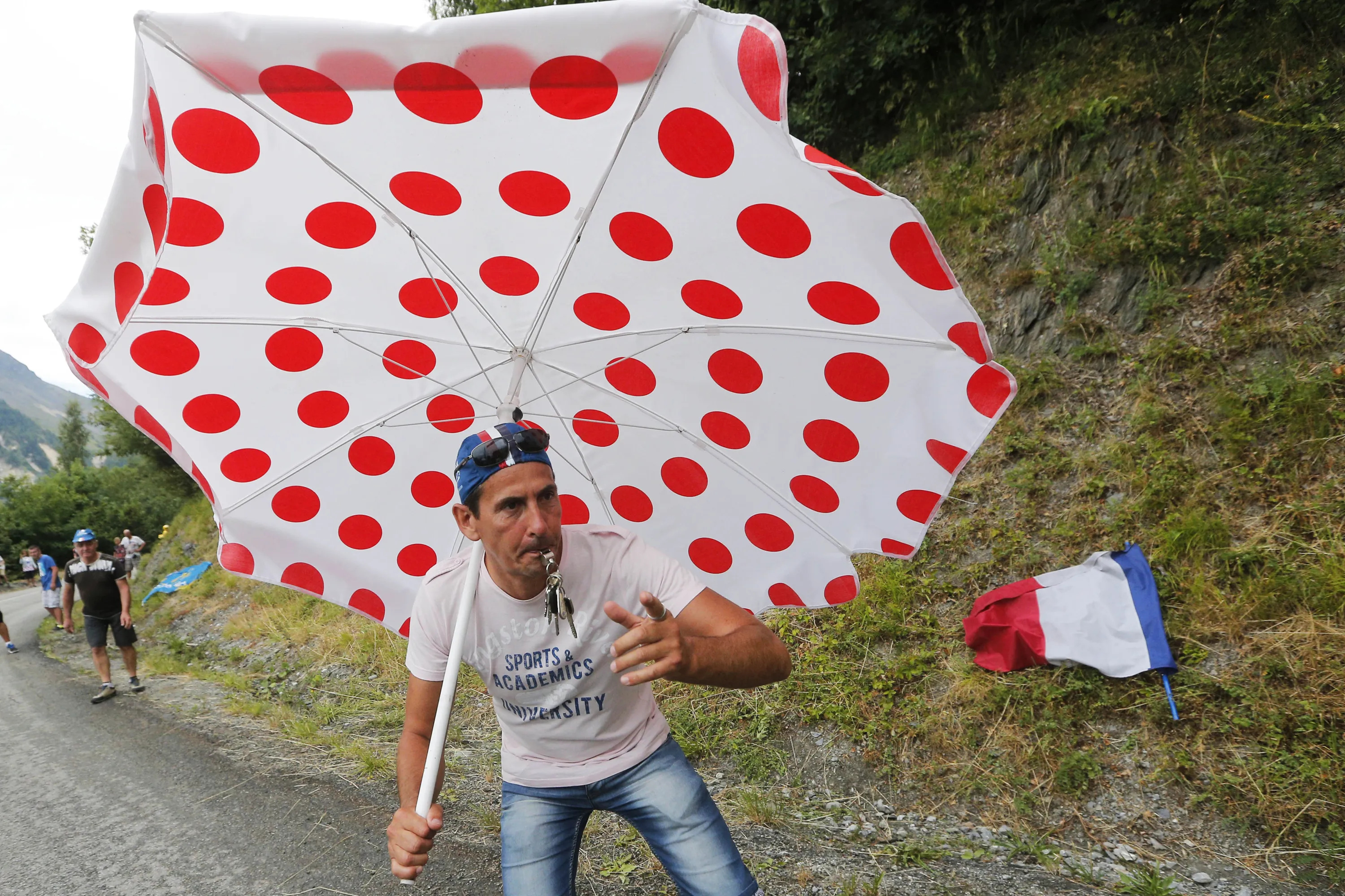 A spectator with an umbrella in the colors of the best climber's dotted jersey waits for the riders during the nineteenth stage of the Tour de France cycling race over 138 kilometers (85.7 miles) with start in Saint-Jean-de-Maurienne and finish in La Toussuire, France, Friday, July 24, 2015. (Photo by Christophe Ena/AP Photo)