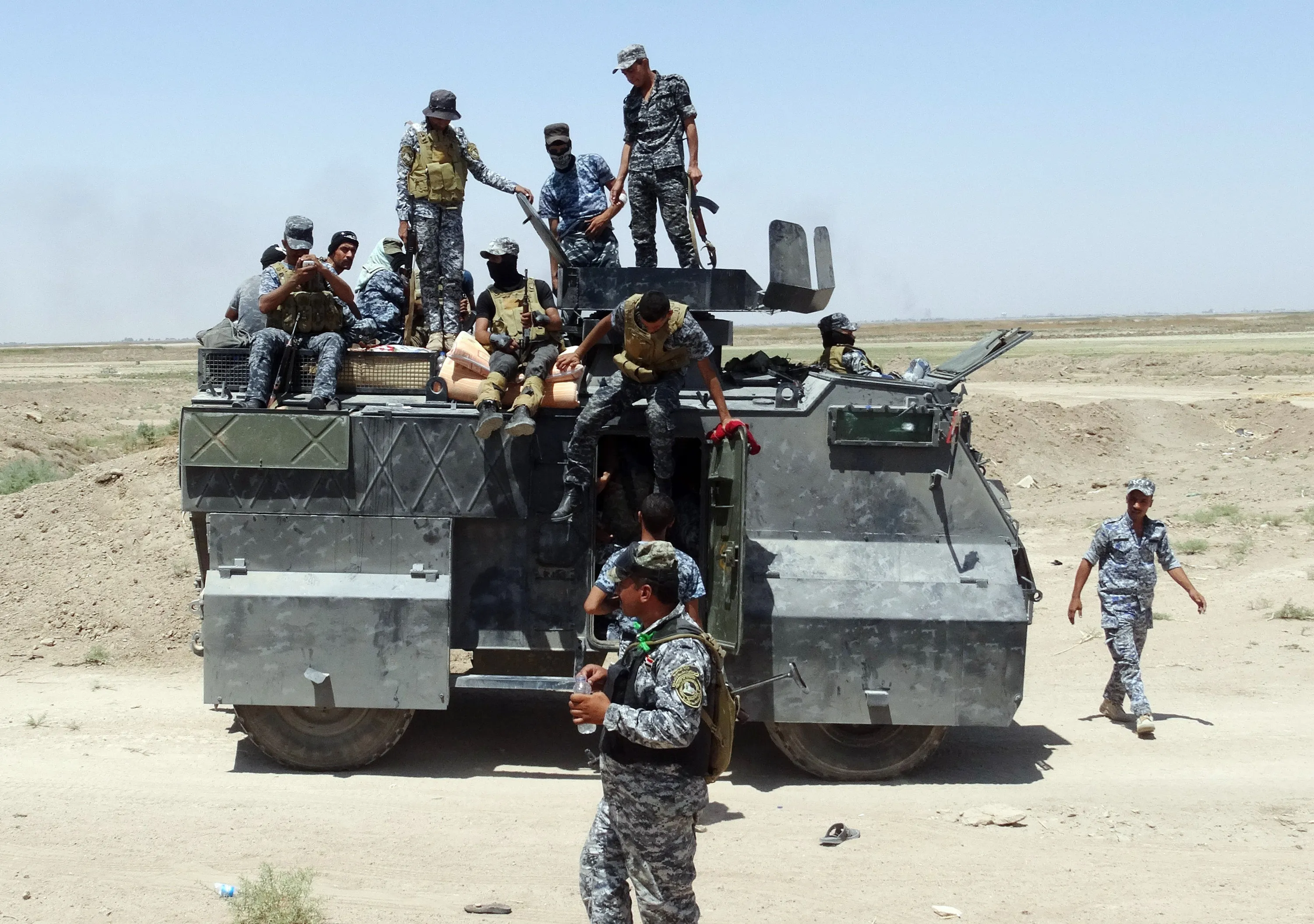 In this Thursday, July 23, 2015 photo, Iraqi federal police forces patrol in an eastern suburb of Ramadi, backed by Shiite and Sunni pro-government fighters and U.S.-led coalition airstrikes against Islamic State group positions in Anbar province, Iraq. (Photo by AP Photo)