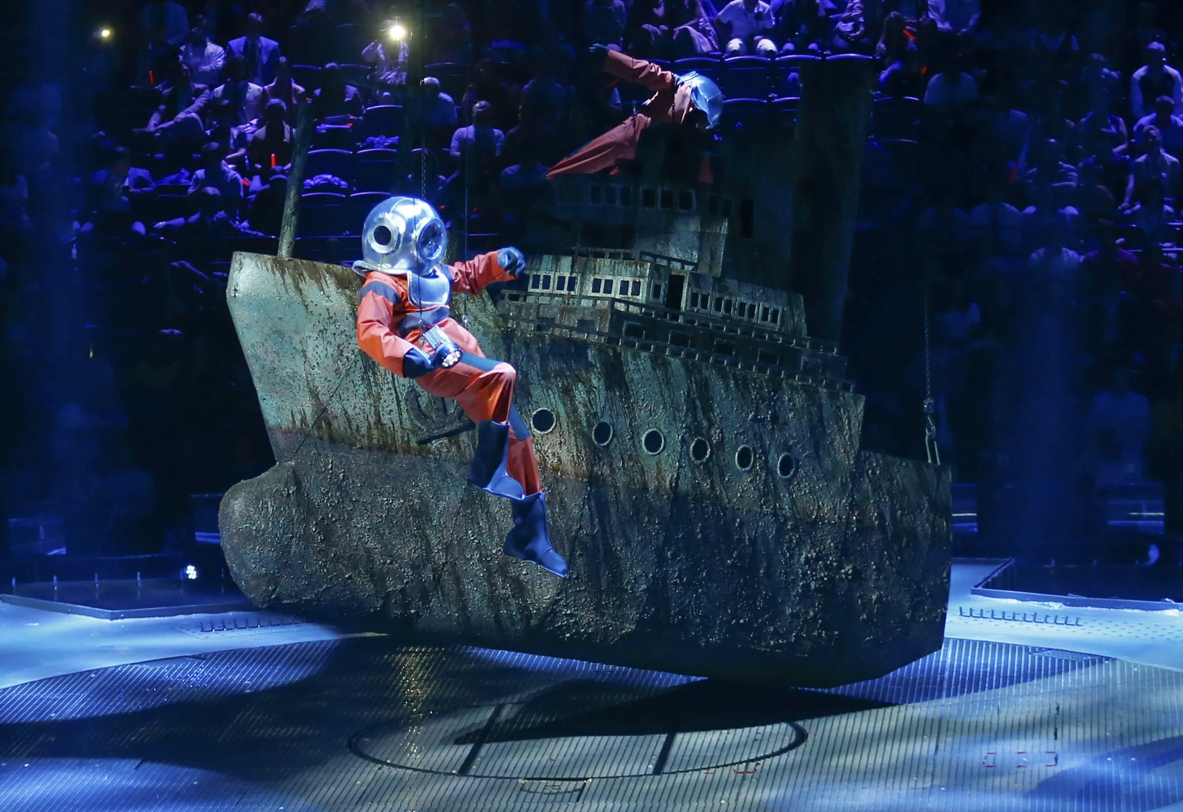 A performer in a diving suit dances next to a mock-up submarine during the opening ceremony for the 16th FINA World Championships in Kazan, Russia, July 24, 2015. (Photo by Hannibal Hanschke/Reuters)