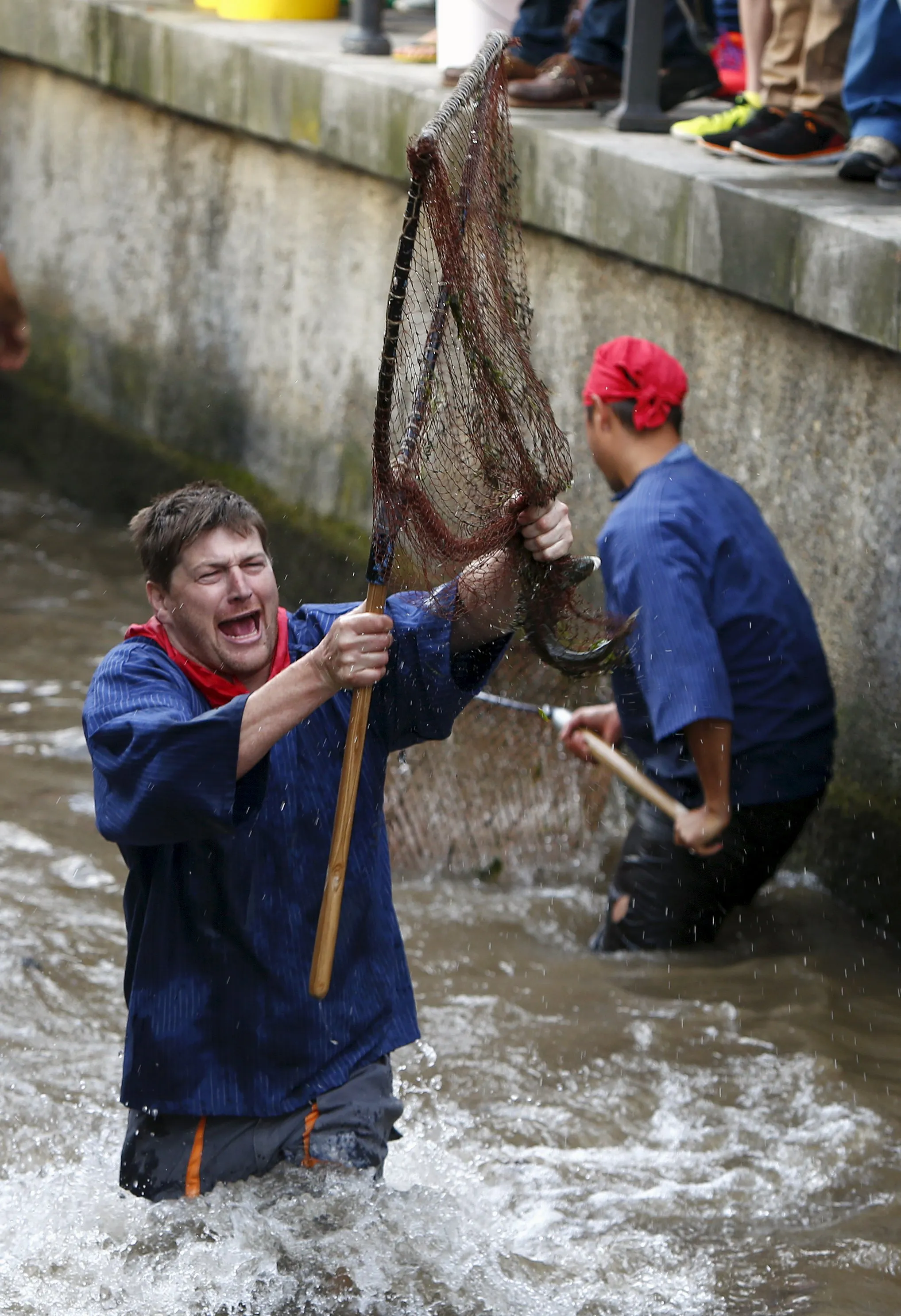 Fisherman Stefan Albrecht reacts as he catches a trout in a small river while celebrating Fischertag (Fisherman's Day) in downtown Memmingen, southern Germany, July 25, 2015. (Photo by Michaela Rehle/Reuters)