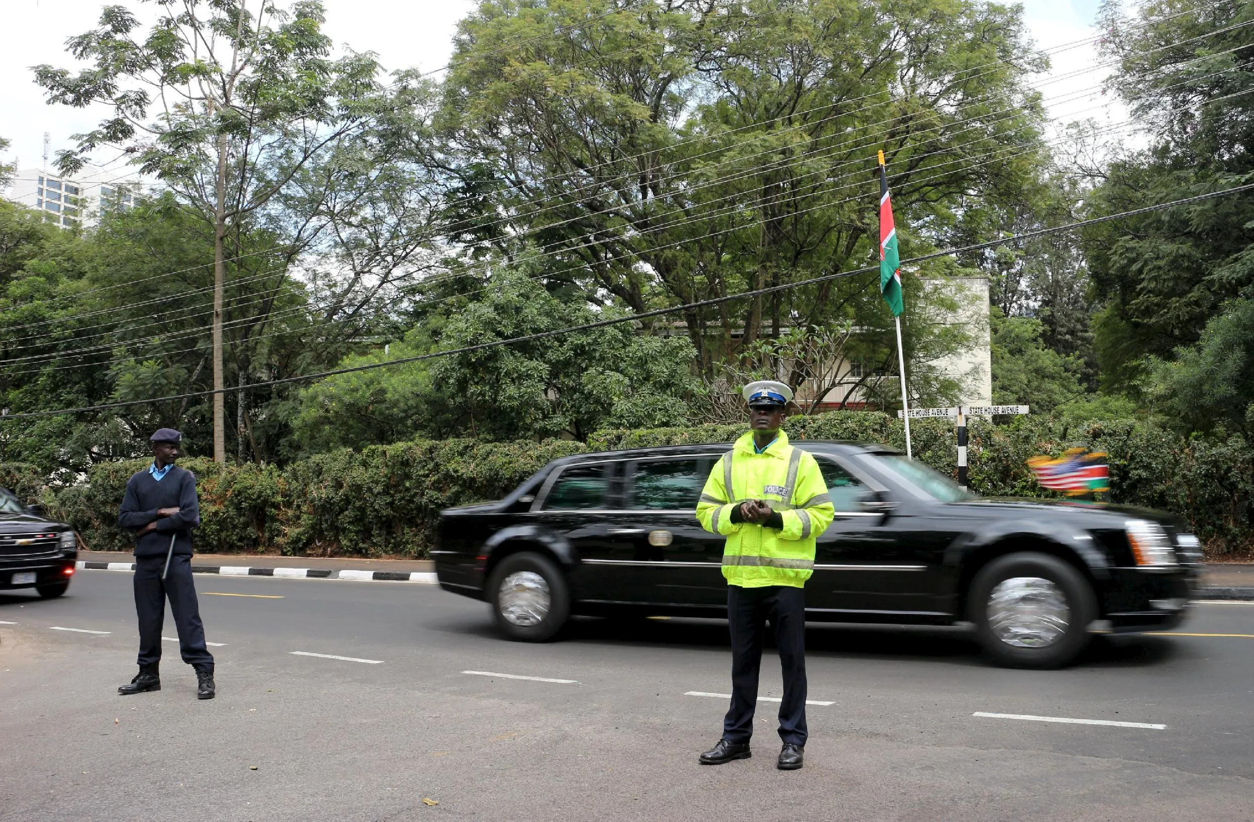 A policeman stands guard as the convoy of U.S. President Barack Obama drives to the State House in Kenya's capital Nairobi July 25, 2015. Obama told African entrepreneurs in Kenya on Saturday they could help counter violent ideologies and drive growth in Africa, and said governments had to assist by ensuring the rule of law was upheld and by tackling corruption. (Photo by Boniface Mwangi/Reuters)