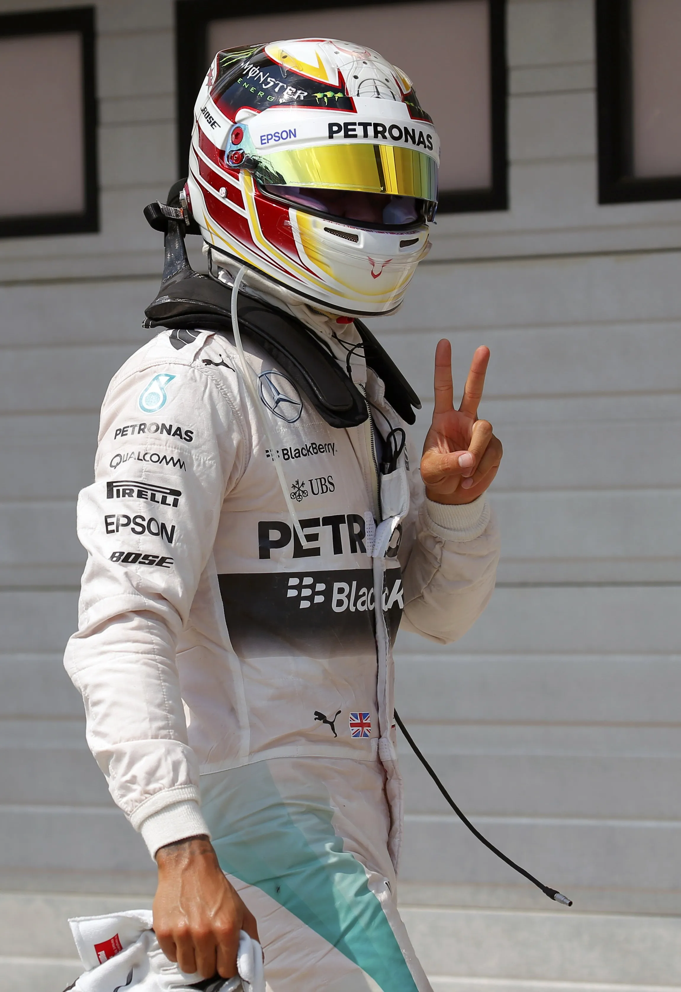 Mercedes Formula One driver Lewis Hamilton of Britain makes victory sign after the qualifying sesson for the Hungarian F1 Grand Prix at the Hungaroring circuit, near Budapest, Hungary July 25, 2015. (Photo by Laszlo Balogh/Reuters)
