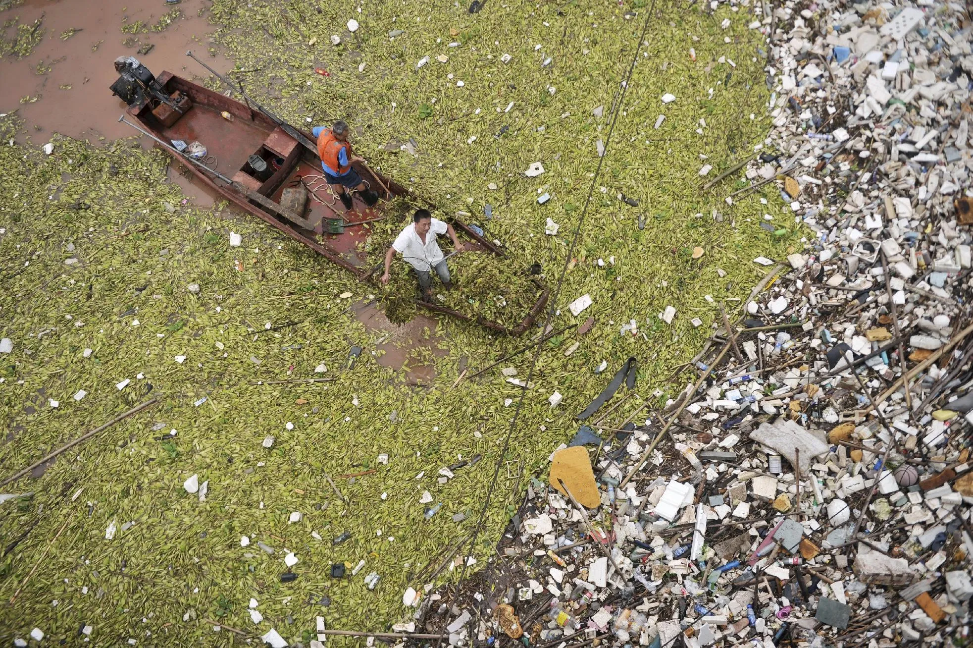 Workers clear floating plants and garbage off the surface of the Yangtze River at a section in Chongqing municipality, China, July 22, 2015. (Photo by Reuters/China Daily)