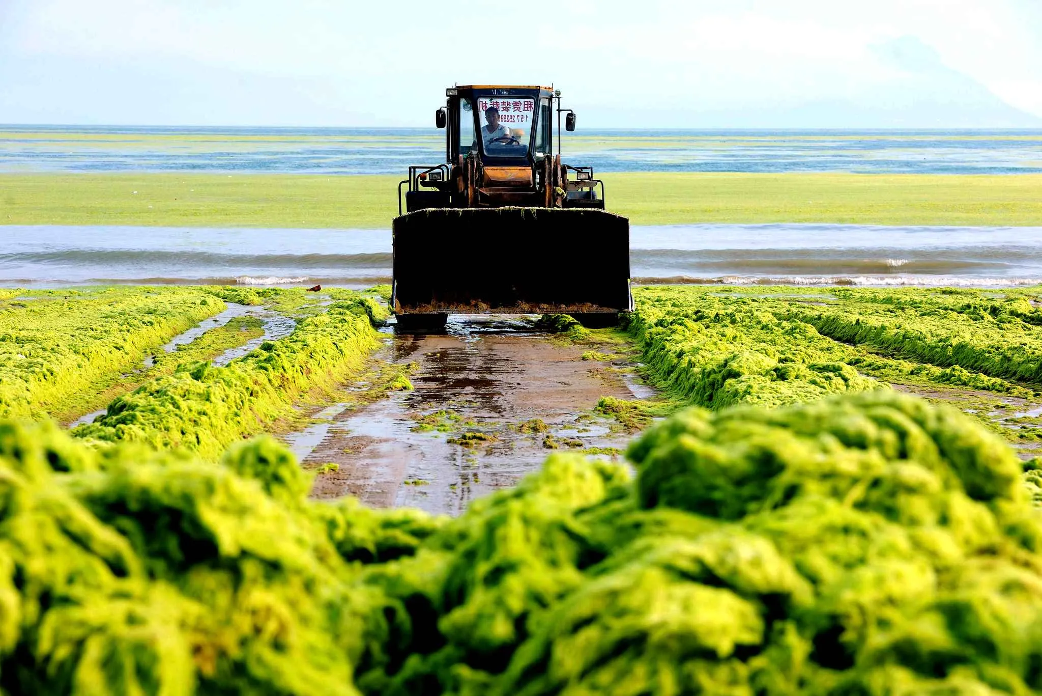 This picture taken on July 22, 2015 shows a worker clearing out algae from the water along a beach in Qingdao, in eastern China's Shandong province. (Photo by AFP Photo/Stringer)
