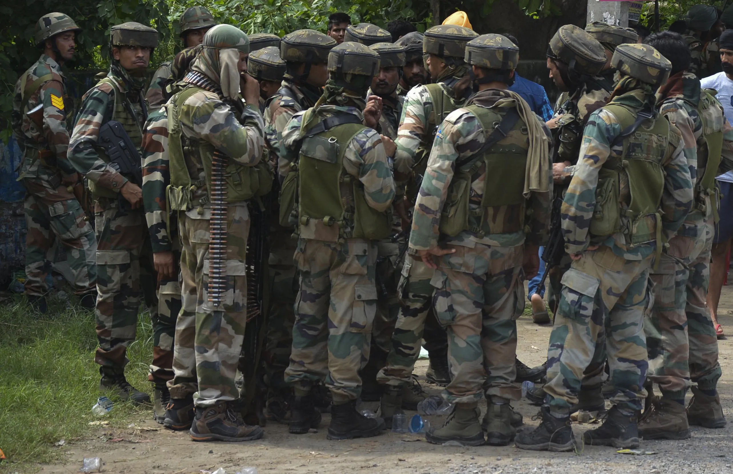 Indian army listen instructions from a higher commander during a fight in the town of Dinanaga, in the northern state of Punjab, India, Monday, July 27, 2015. Indian army commandos joined police in fighting suspected militants who fired at a bus station and stormed into police barracks on the outskirts of a northern town bordering Pakistan early Monday. Rebels have been fighting for an independent Kashmir or its merger with Pakistan since 1989. (Photo by Prabhjot Gill/AP Photo)