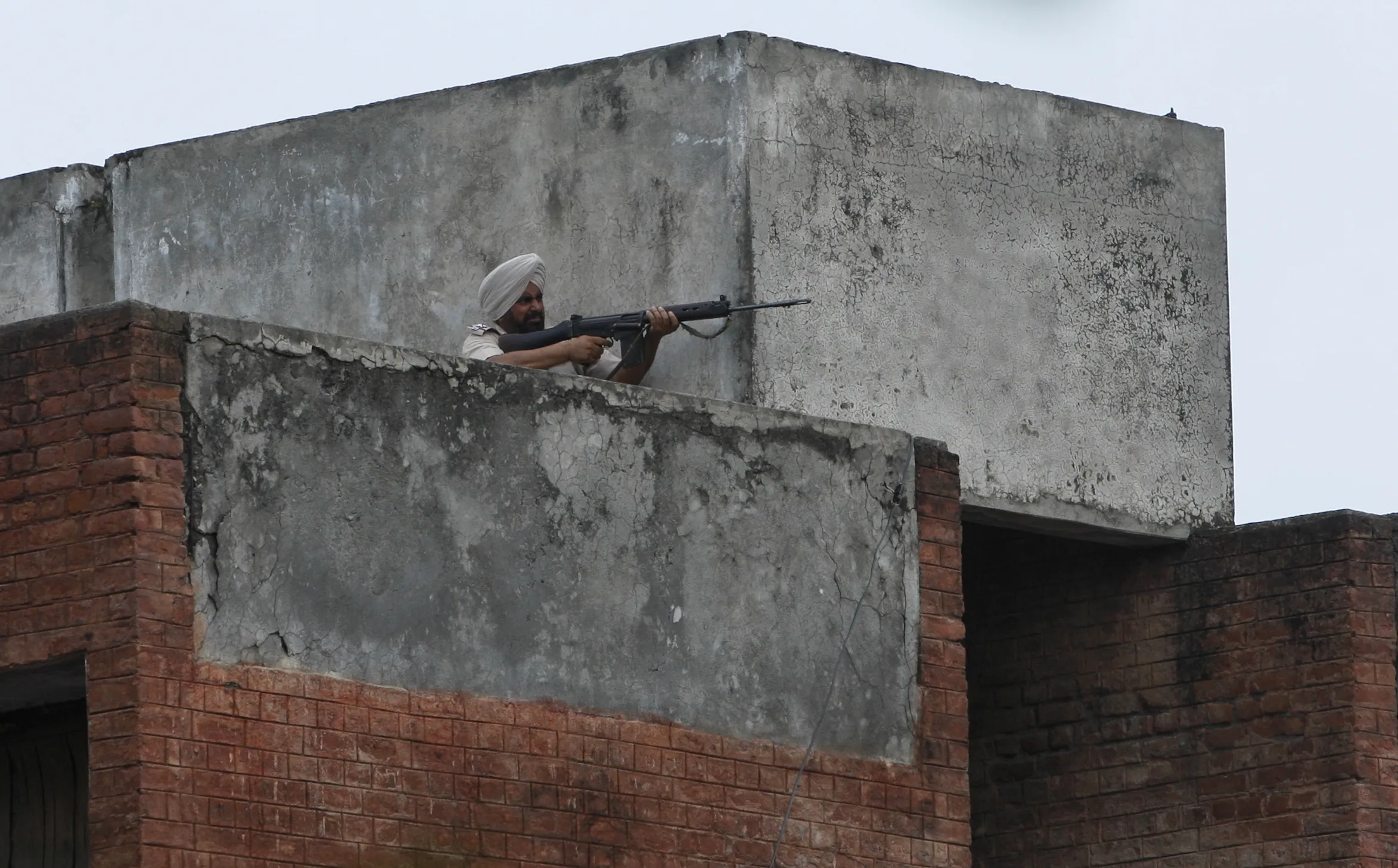 Indian policeman fires a shot during a gunfight in the town of Dinanagar, in the northern state of Punjab, India, Monday, July 27, 2015. (Photo by Channi Anand/AP Photo)