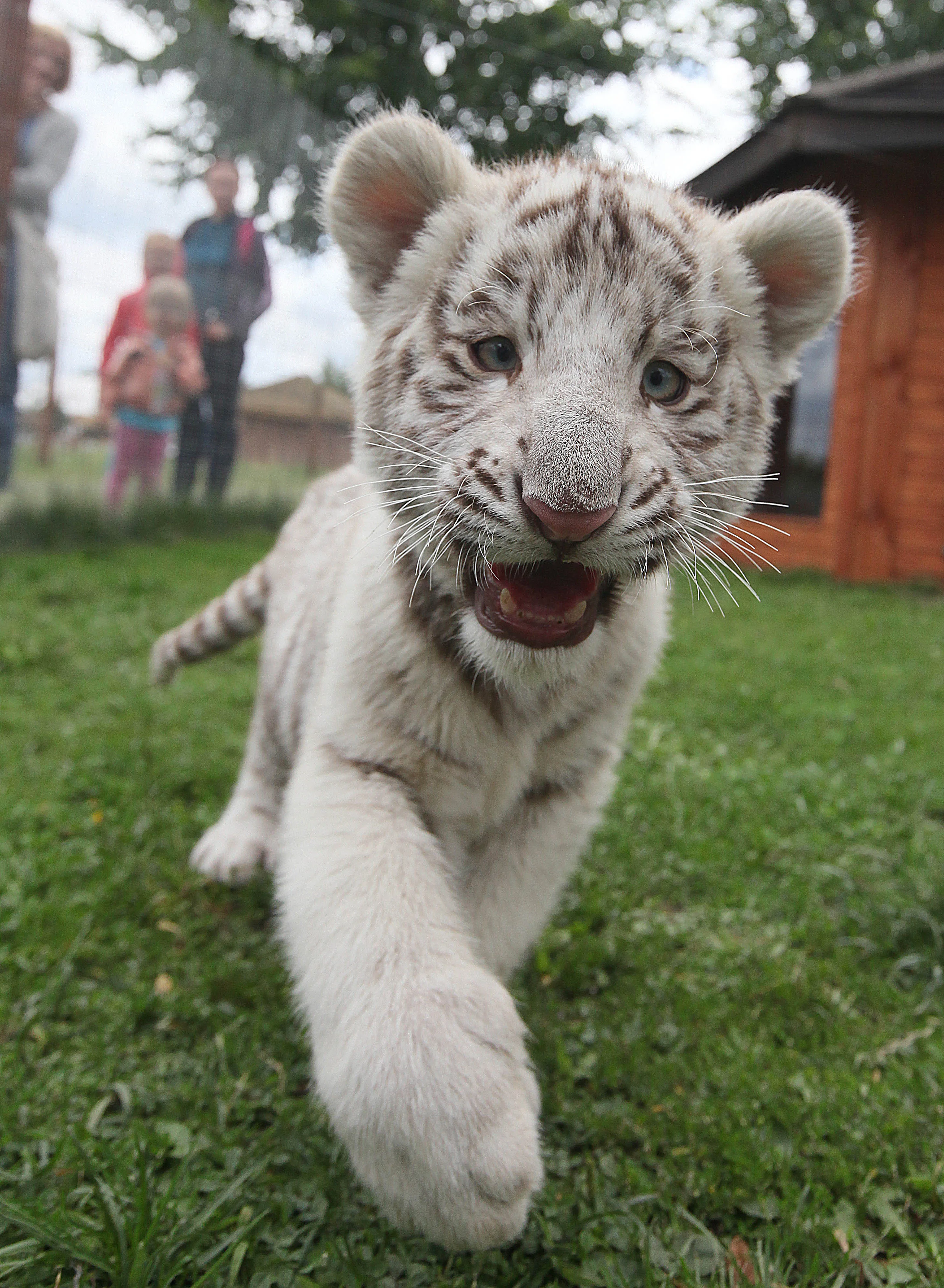 People watch three-months-old white Bengal tiger in the enclosure at a private zoo in Borysew, Poland, on Sunday, July 26, 2015. They were rejected by their mother after birth and have been bottle-fed by the zoo staff. (Photo by Czarek Sokolowski/AP Photo)