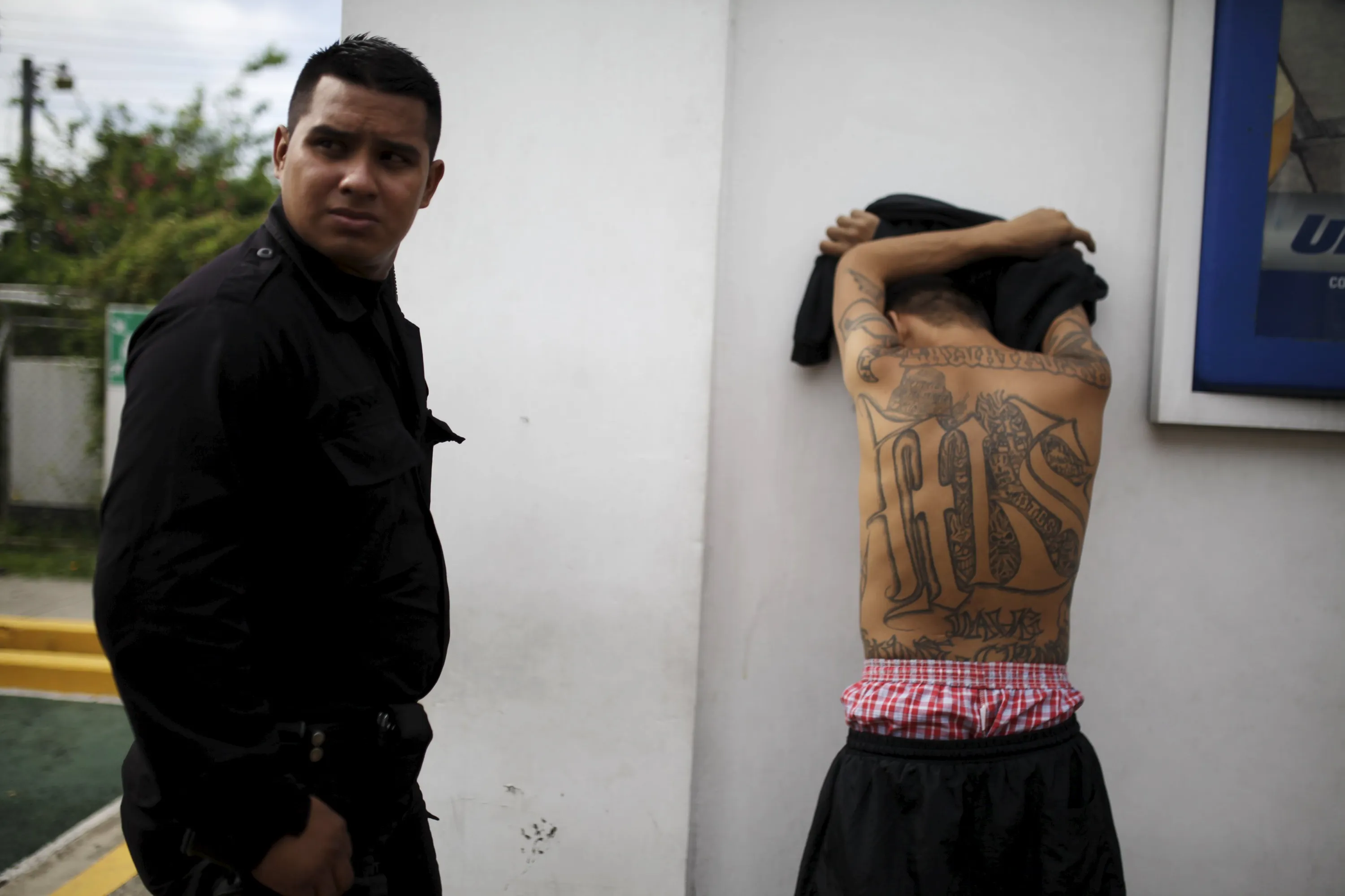 A policeman detains a suspected member of the MS-13 gang at a check point during the second day of a suspension of public transport services in Apopa, El Salvador July 28, 2015. (Photo by Jose Cabezas/Reuters)