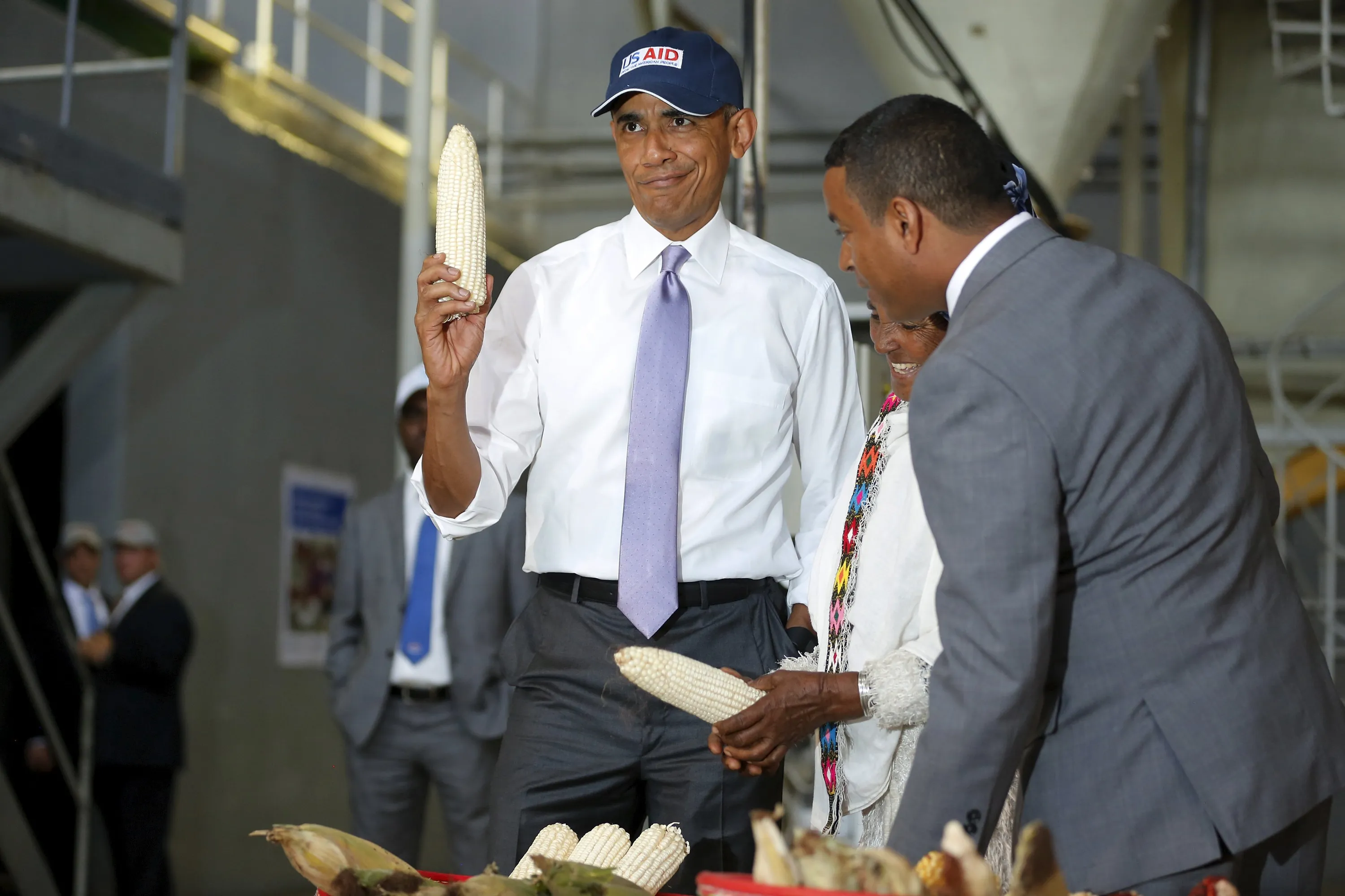 U.S. President Barack Obama (L) shows off a ear of corn grown by a farmer (2nd R) participating in the Feed the Future program as he tours the Faffa Food factory in Addis Ababa, Ethiopia July 28, 2015. Obama told Ethiopia's leaders on Monday that allowing more political freedoms would strengthen the African nation, which had already lifted millions out of a poverty once rooted in recurring famine. (Photo by Jonathan Ernst/Reuters)