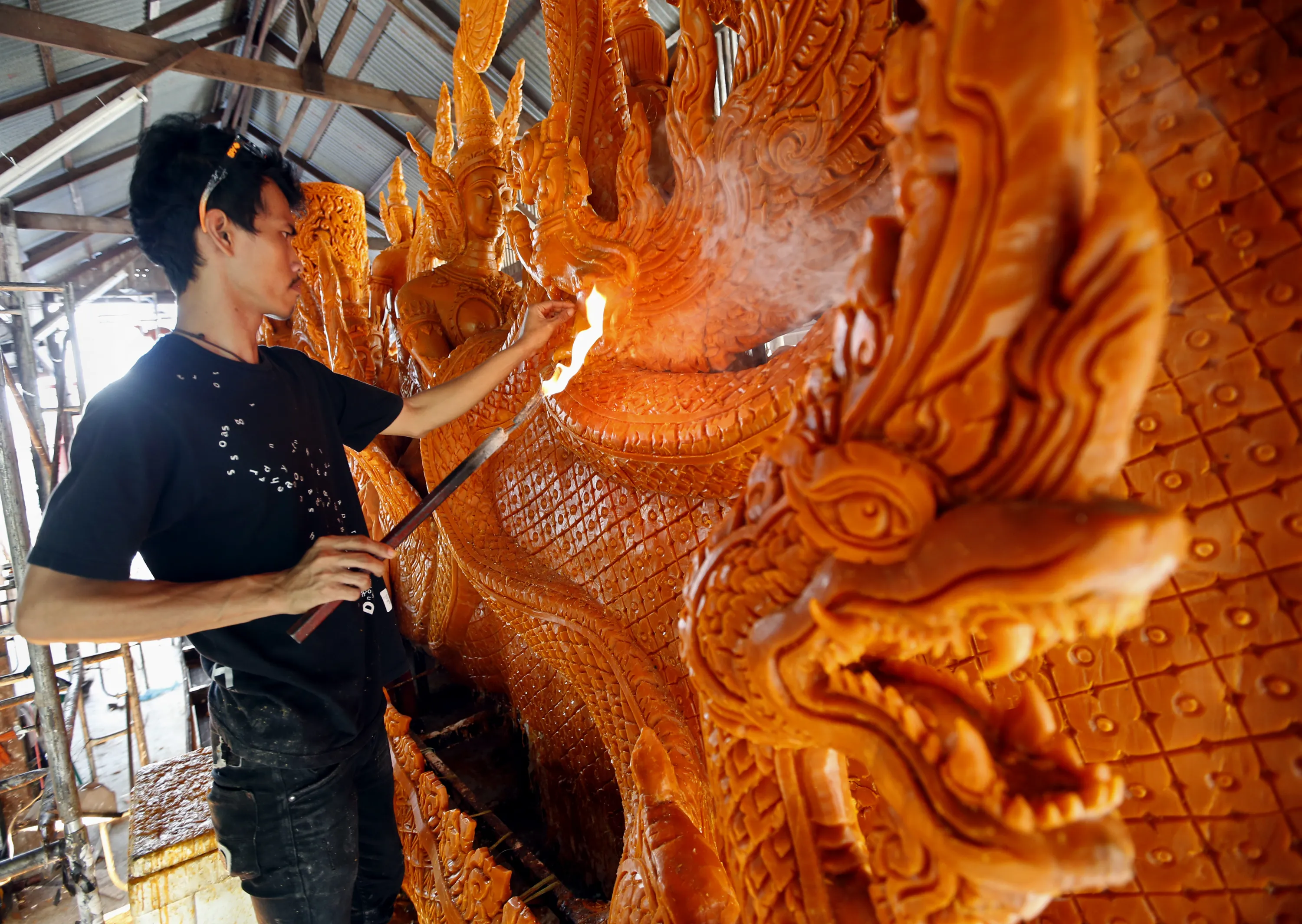 Thai worker gives final touch to an ornately-carved bee wax candle depicting scene from the Buddhist mythology in preparation for a candle procession parade to mark the start of the Buddhist Lent, at a temple in the Ubon Ratchathani province, northeastern Thailand, July 28, 2015. The Buddhist Lent or 'Khao Pansa' is a three-month long period beginning on the first day after the full moon of the eight lunar month which this year falls on July 31. Buddhist monks must reside inside their temples to study and meditate. This is also the most auspicious time for Buddhist ordinations since it marks a period of renewed spiritual vigour. (Photo by Rungroj Yongrit/EPA)