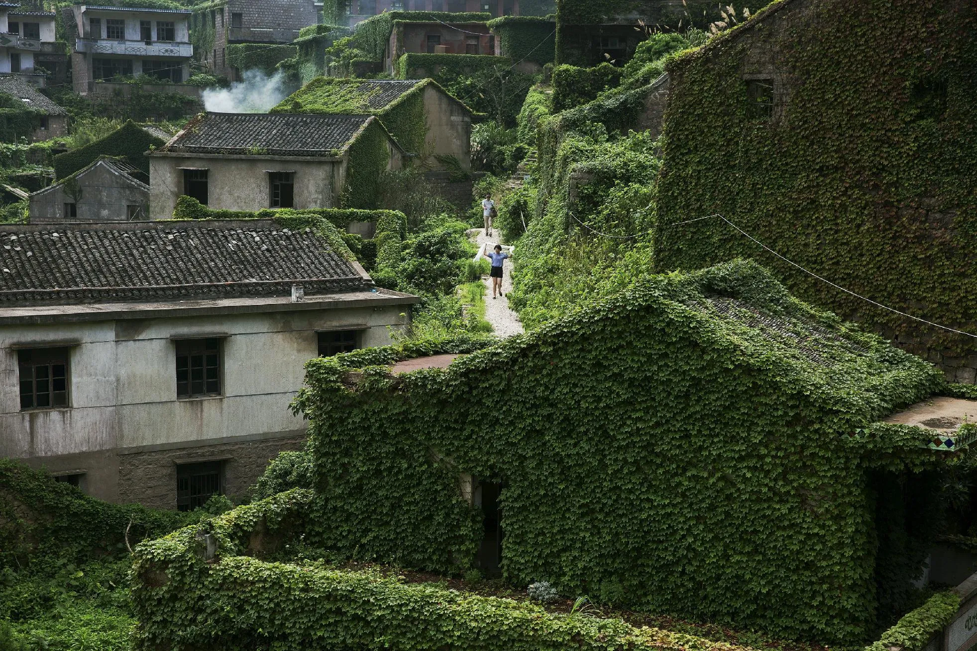 Tourists walk between buildings covered with vines in the abandoned fishing village of Houtouwan on the island of Shengshan July 26, 2015. Just a handful of people still live in a village on Shengshan Island east of Shanghai that was once home to more than 2,000 fishermen. Every day hundreds of tourists visit Houtouwan, making their way on narrow footpaths past tumbledown houses overtaken by vegetation. The remote village, on one of more than 400 islands in the Shengsi archipelago, was abandoned in the early 1990s as first wealthy residents then others moved away, aiming to leave problems with education and food delivery behind them. (Photo by Damir Sagolj/Reuters)