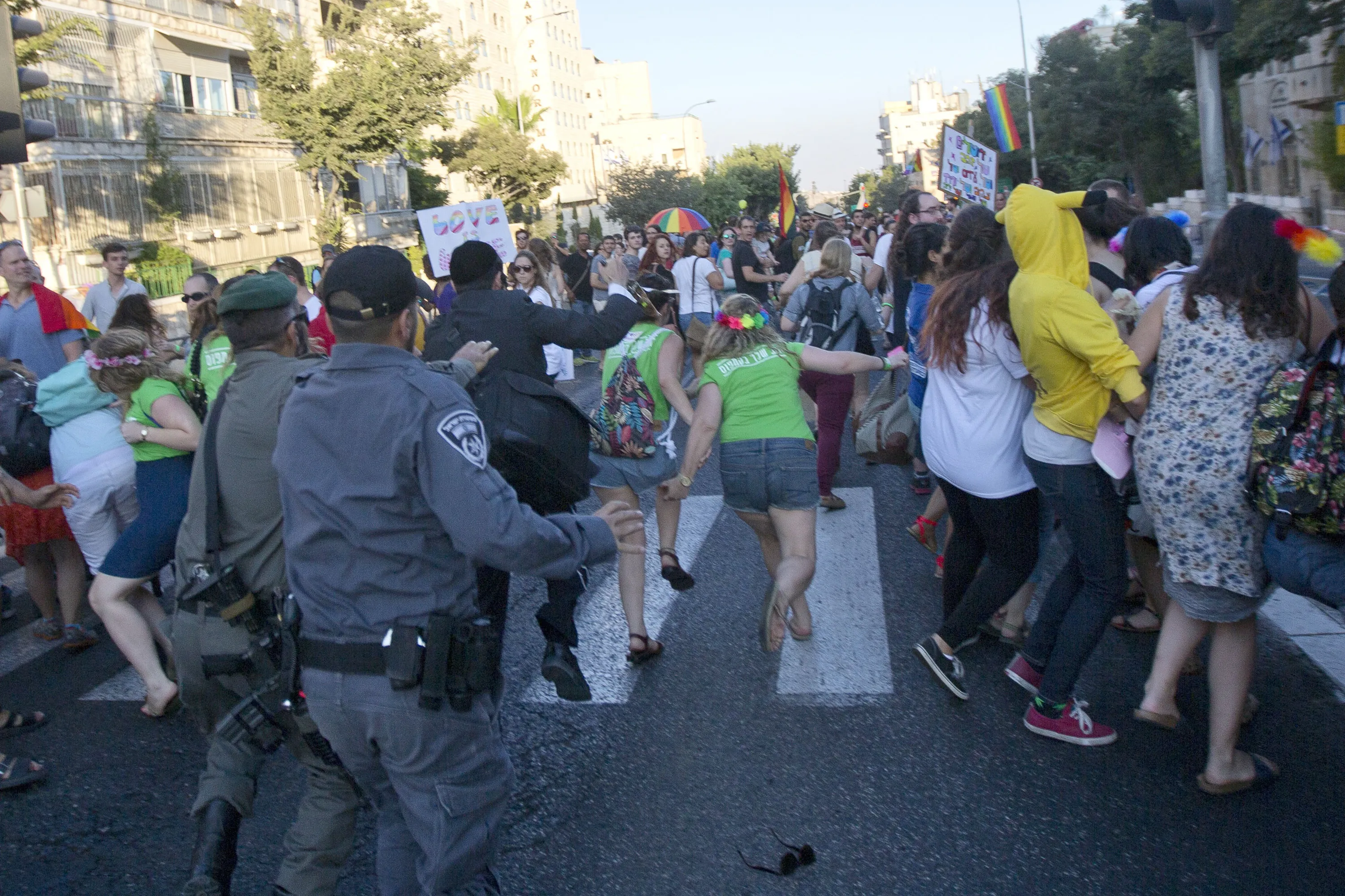 Israeli security forces reach for an ultra-Orthodox Jew attacking people with a knife during a Gay Pride parade Thursday, July 30, 2015 in central Jerusalem. (Photo by Sebastian Scheiner/AP Photo)