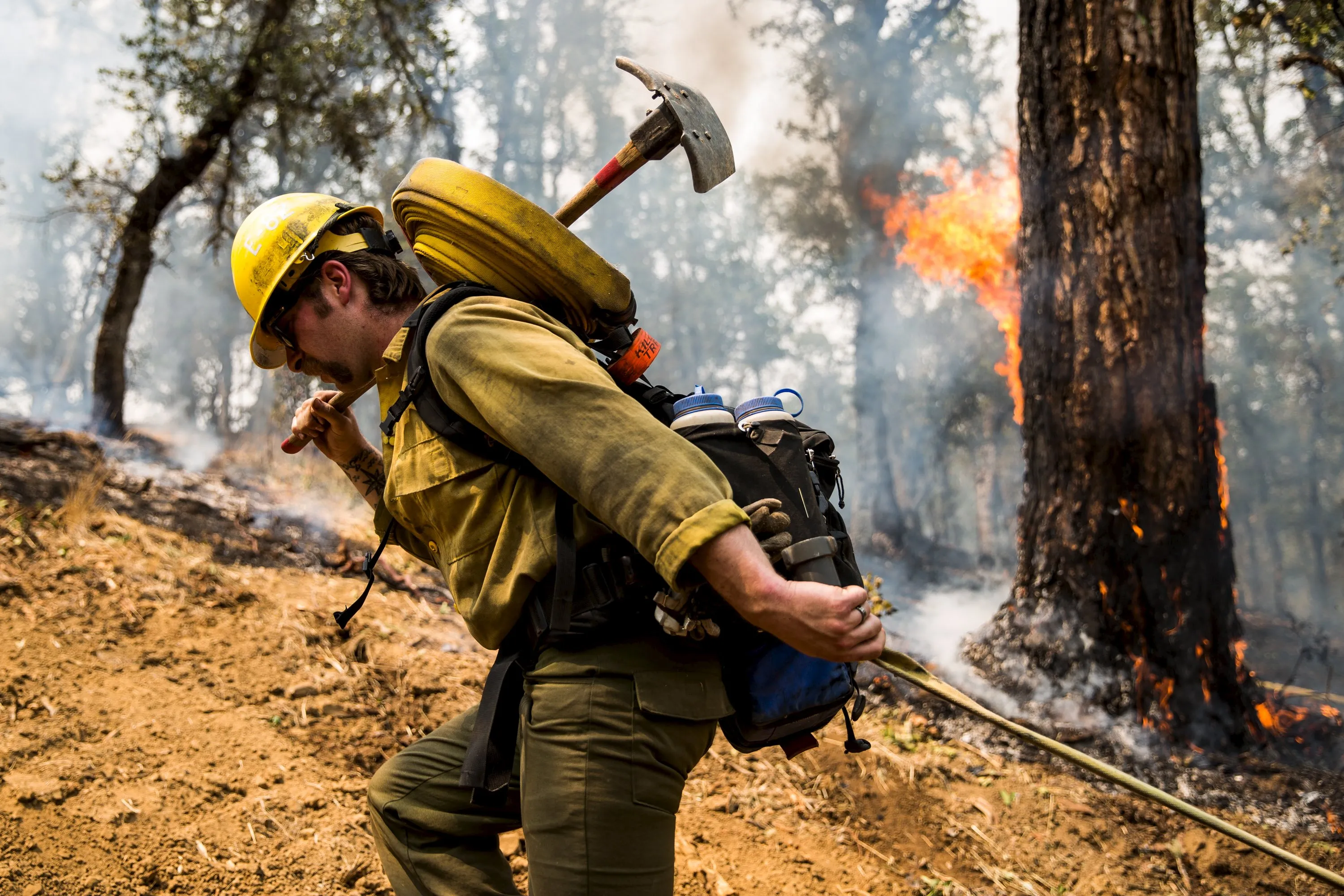 Lassen National Forest Service Assistant Fire Engine Operator Adam Giordano drags a hose up a fire line at the Rocky Fire in Lake County, California July 30, 2015. The Rocky Fire broke out on Wednesday afternoon in Lake County, 110 miles (180 km) north of San Francisco. By Thursday morning it had spread to 8,000 acres (3,237 hectares), according to the California Department of Forestry and Fire Protection, known as Cal Fire. REUTERS/Max Whittaker