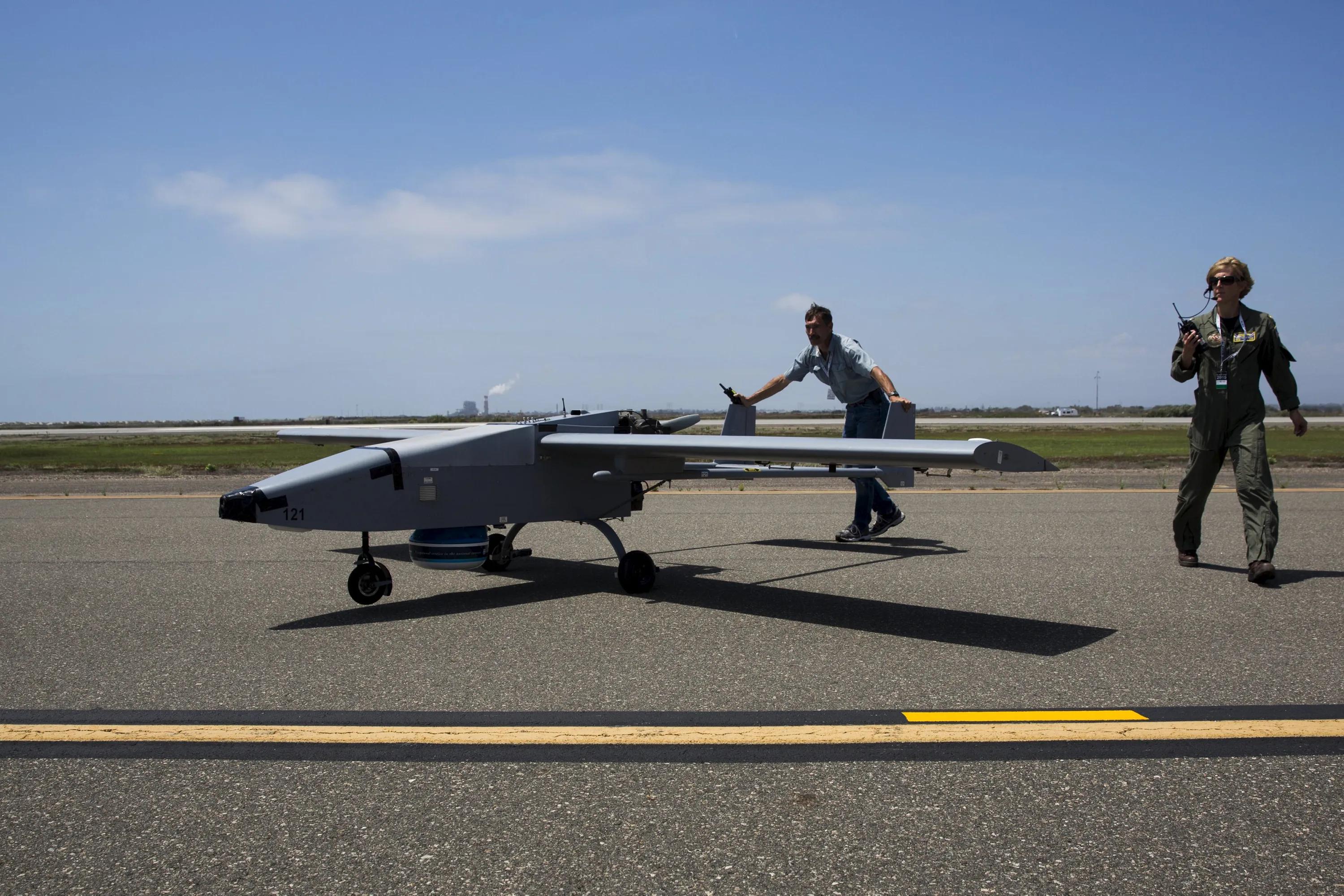 The Navmar Applied Sciences Corp. TigerShark is escorted off the runway after landing during “Black Dart”, a live-fly, live fire demonstration of 55 unmanned aerial vehicles, or drones, at Naval Base Ventura County Sea Range, Point Mugu, near Oxnard, California July 31, 2015. (Photo by Patrick T. Fallon/Reuters)