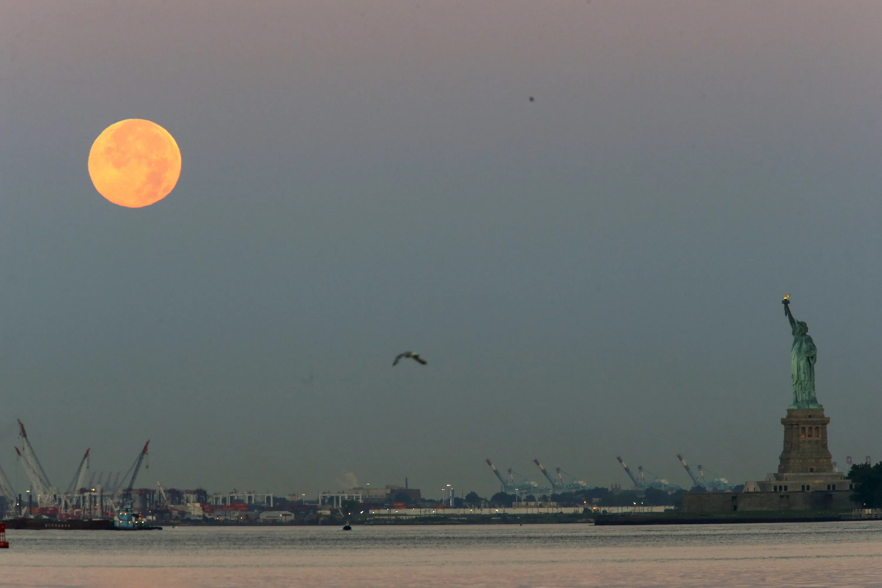 The effect known as Blue Moon is seen next to the Statue of Liberty in New York July 31, 2015. The Blue Moon effect refers to the second full moon in a calendar month, local media informed. (Photo by Eduardo Munoz/Reuters)