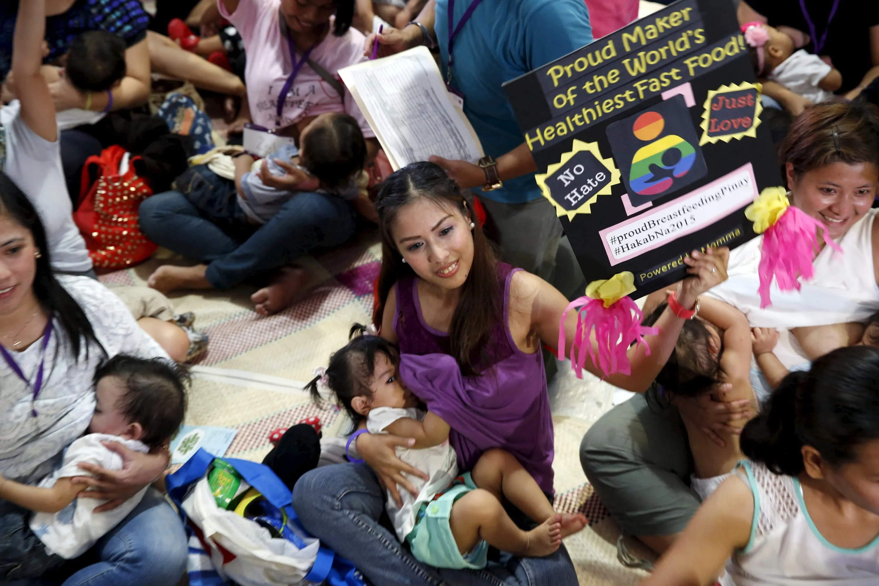 A mother displays a placard as she breastfeeds her child in Mandaluyong city, Metro Manila in the Philippines August 1, 2015. A statement from a non-government organization Breastfeeding Pinays said that in celebration of the National Breastfeeding Awareness Month in August, they organized a one day breastfeeding activity called “Hakab Na 2015”. (Photo by Erik De Castro/Reuters)