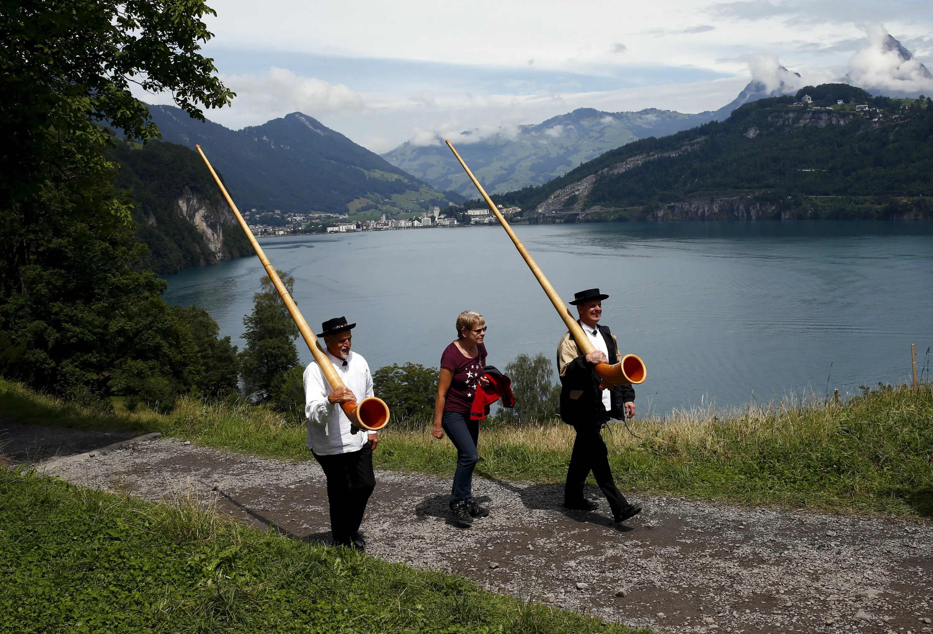 Spectators and alphorn blowers arrive for the Swiss national holiday celebrations on the Ruetli meadows in central Switzerland August 1, 2015. (Photo by Arnd Wiegmann/Reuters)