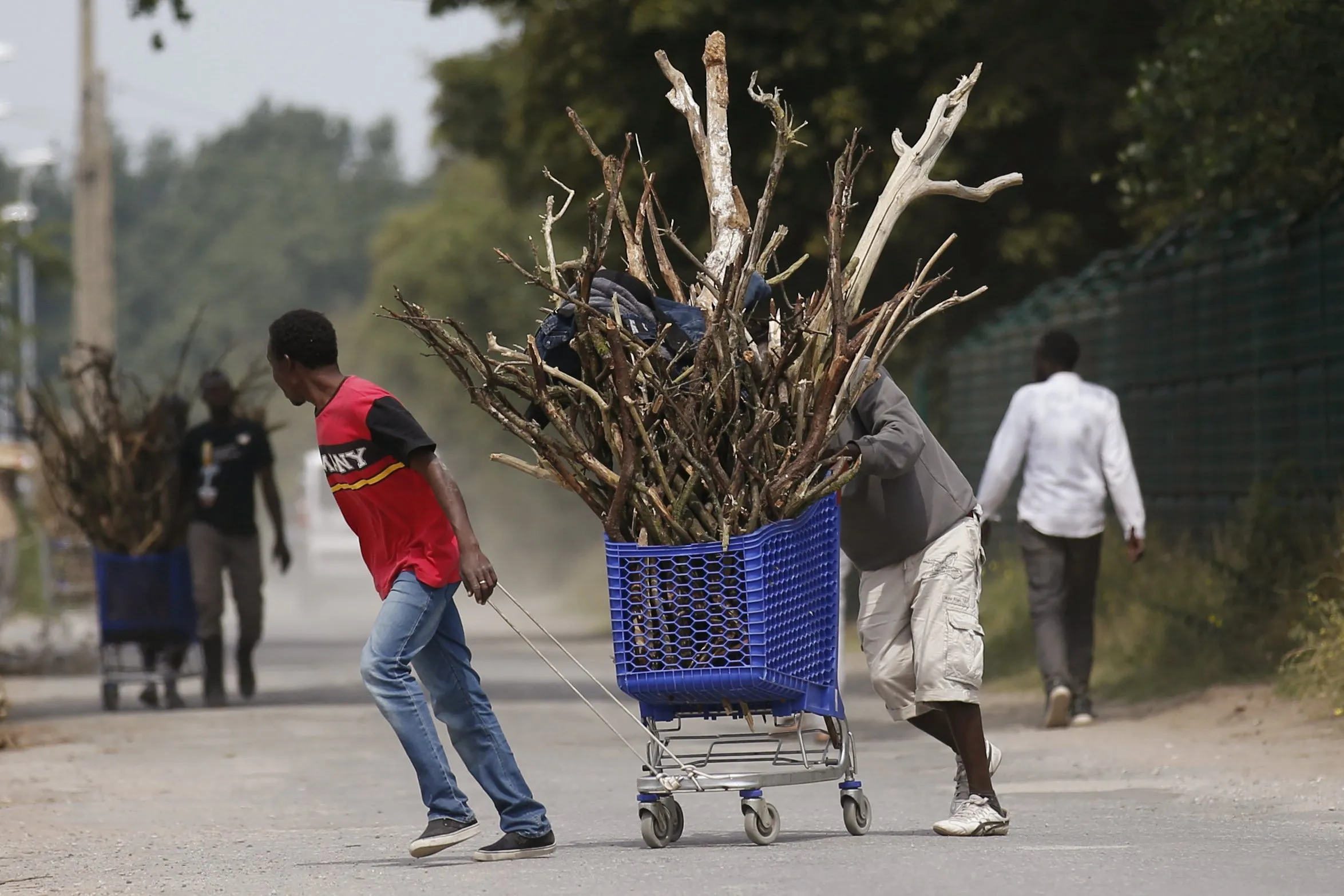 Migrants transport firewood in a shopping cart in “The New Jungle” near Calais, France, August 1, 2015. Some 3,000 migrants live around the tunnel entrance in a makeshift camp known as “The Jungle”, making the northern French port one of the frontlines in Europe's wider migrant crisis. (Photo by Pascal Rossignol/Reuters)