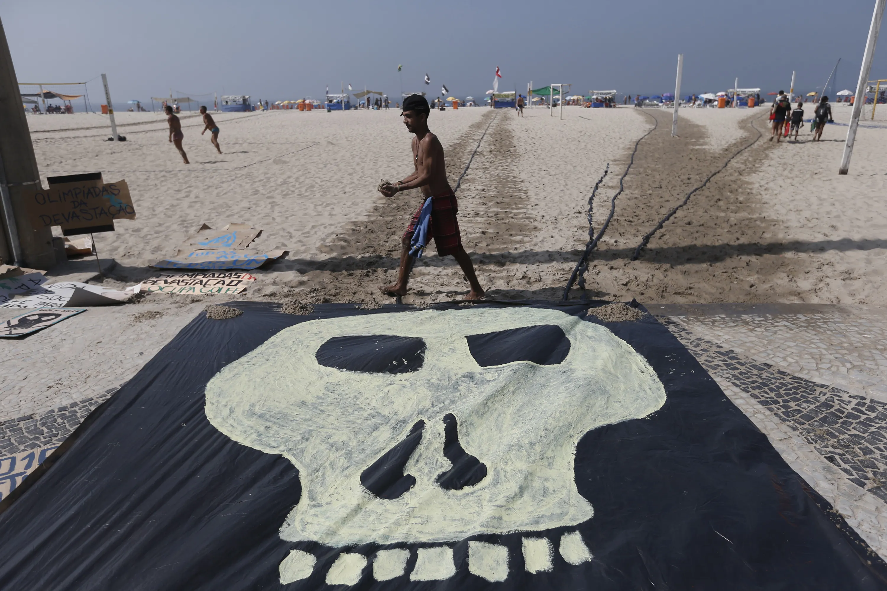 A man walks past a banner with a drawing of a skull symbolizing the death of nature during a protest on the Copacabana beach in Rio de Janeiro, Brazil, Saturday, August 1, 2015. Less than a dozen people showed up for a scheduled protest by environmentalists against the money spent in preparation for the Olympics and the construction of the game's golf course that was partially carved out of a nature reserve. (Photo by Silvia Izquierdo/AP Photo)
