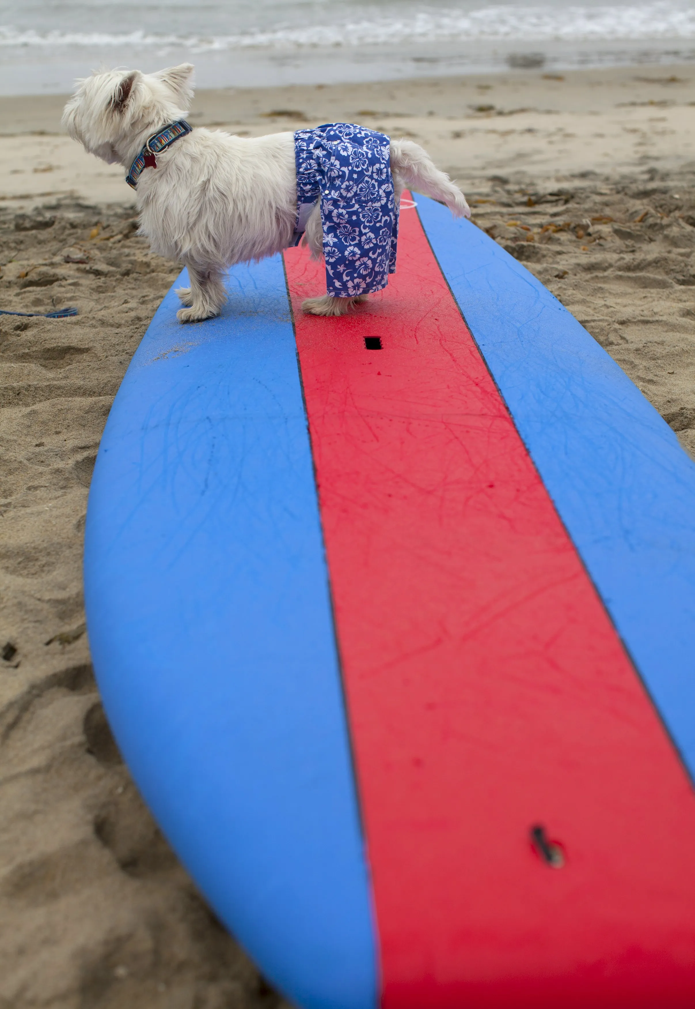 Joey, a westside terrier, stands on his surfboard waiting to compete in the 10th annual Petco Unleashed surf dog contest at Imperial Beach, California August 1, 2015. (Photo by Mike Blake/Reuters)