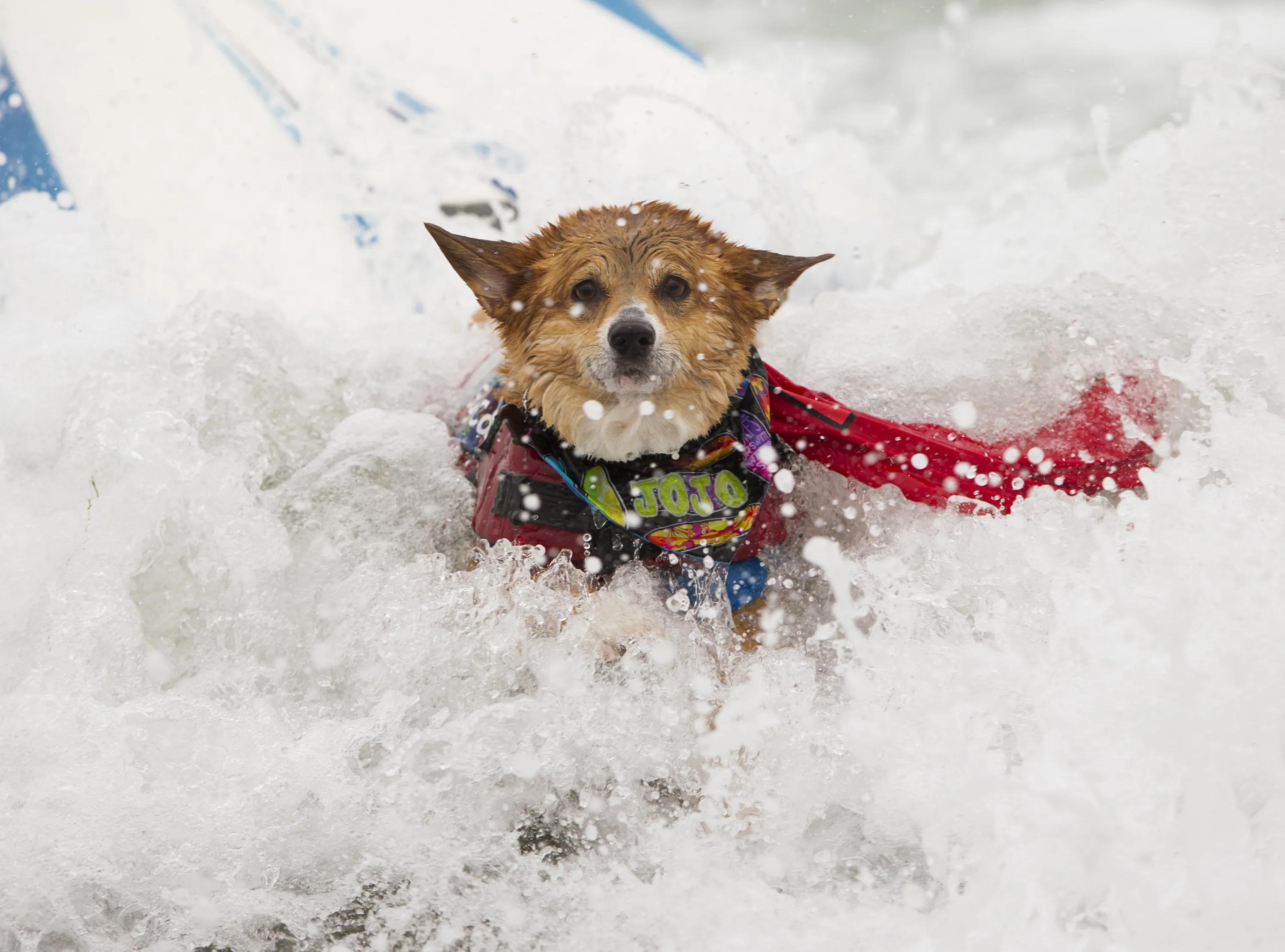 A corgi named Jojo crashes while riding a wave in the medium size dog competition during the 10th annual Petco Unleashed surfing dog contest at Imperial Beach, California August 1, 2015. (Photo by Mike Blake/Reuters)