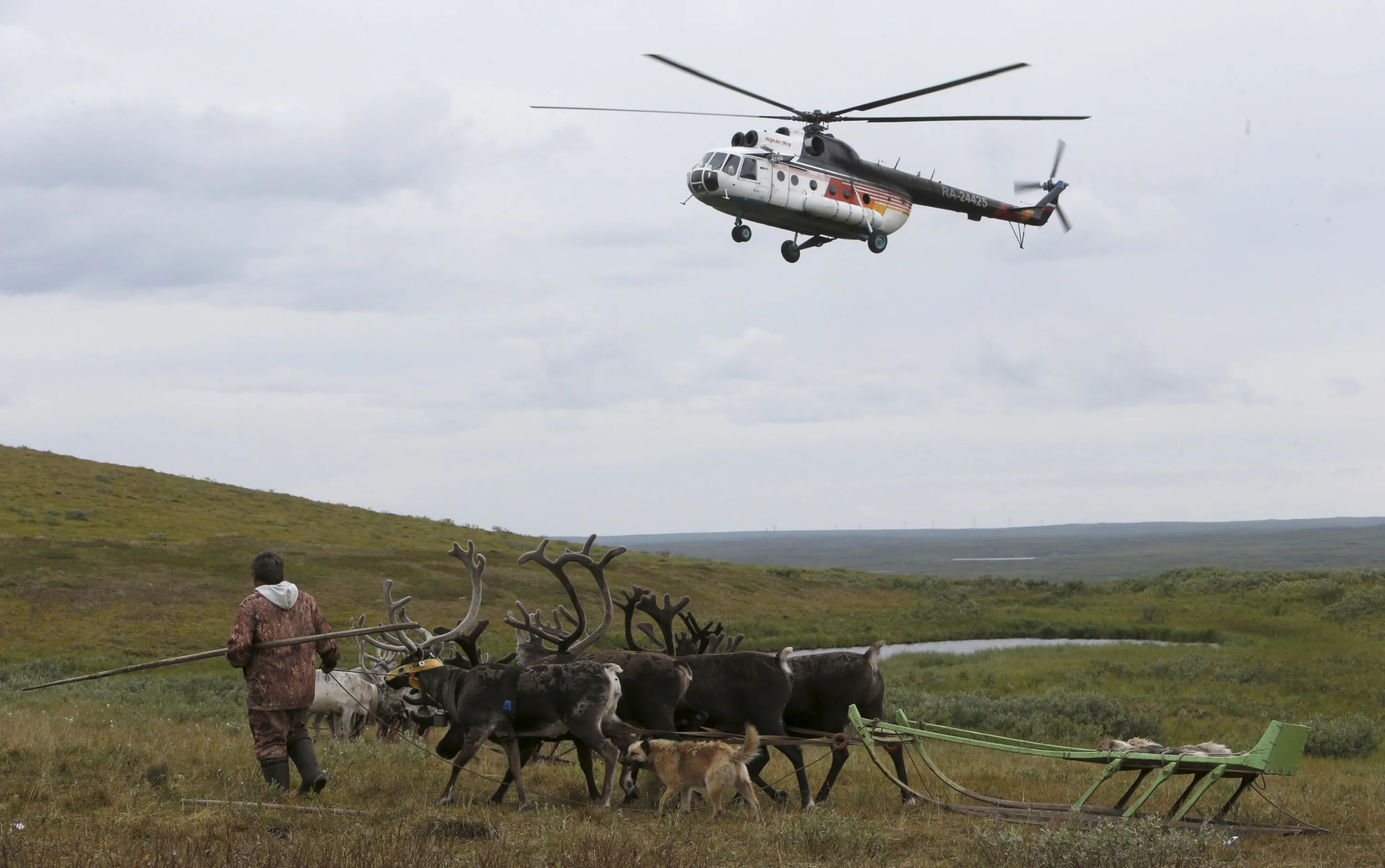 A helicopter flies above a reindeer camping ground, some 200 km (124 miles) northeast of Naryan-Mar, the administrative centre of Nenets Autonomous Area, far northern Russia, August 2, 2015. (Photo by Sergei Karpukhin/Reuters)