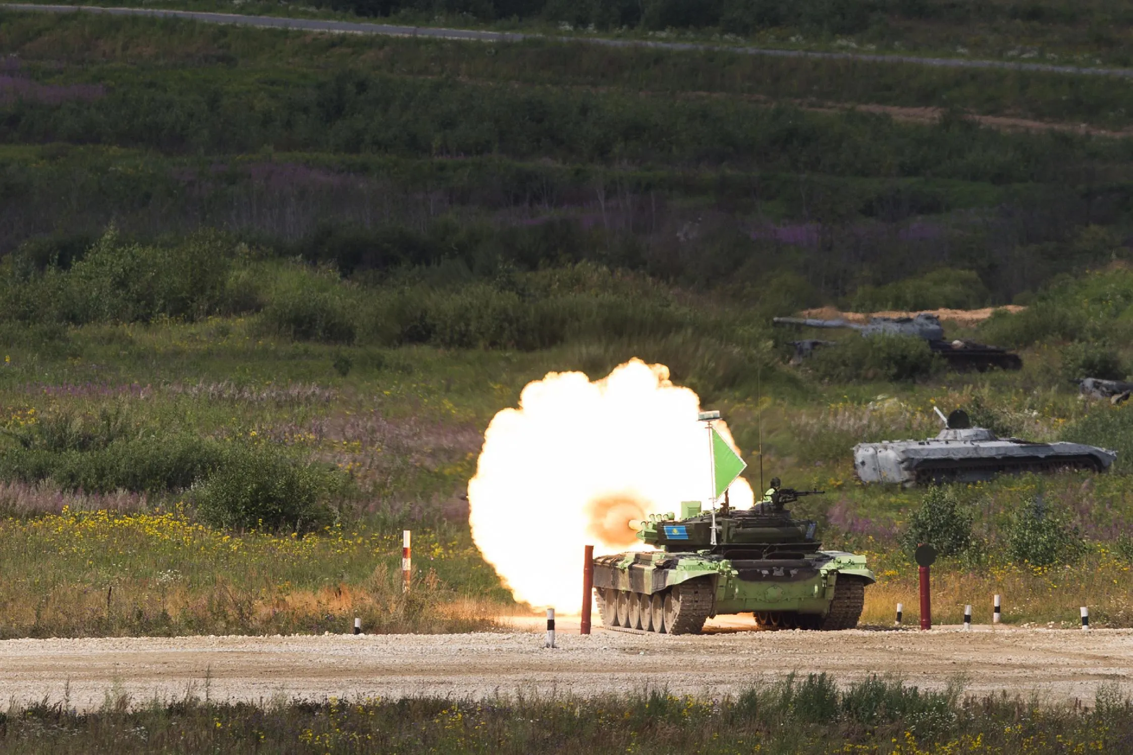 A Kazakhstan tank fires it's main armament during competition in Alabino, outside Moscow, Russia, Monday, August 3, 2015. (Photo by Pavel Golovkin/AP Photo)