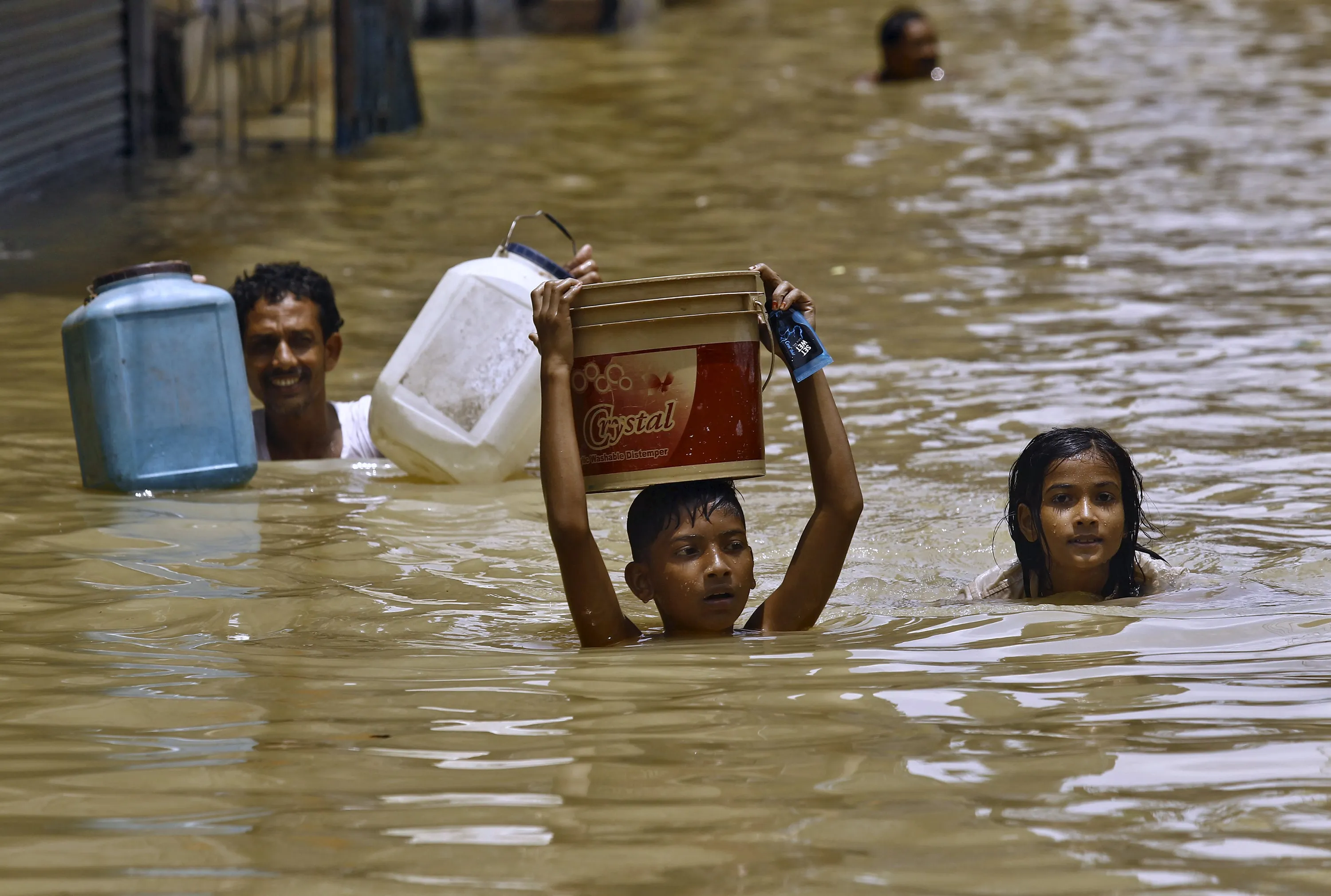 Flood-affected people carry empty containers to collect drinking water as they wade through a flooded street at West Midnapore district in West Bengal, India, August 4, 2015. (Photo by Rupak De Chowdhuri/Reuters)