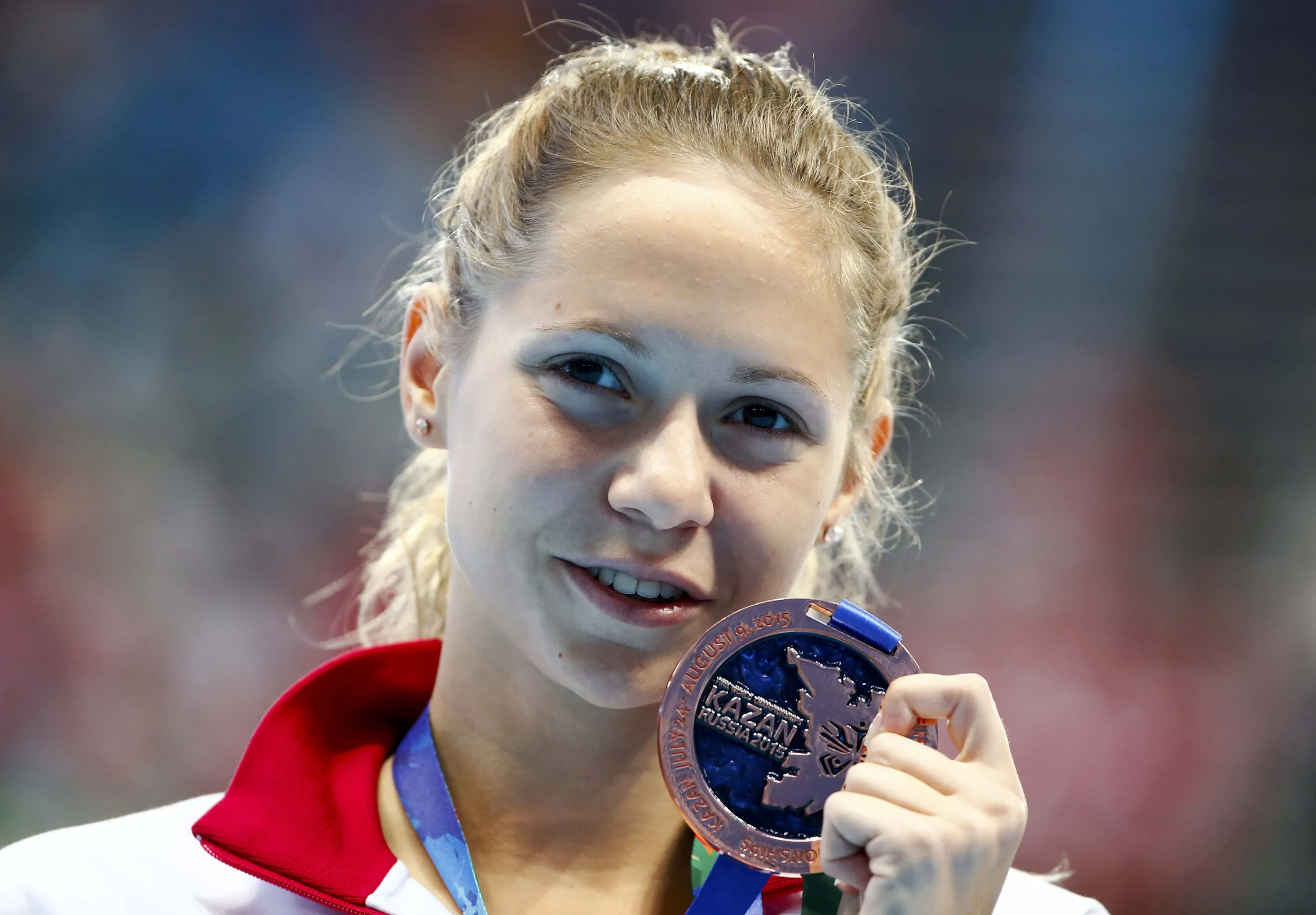 Boglarka Kapas of Hungary poses with her bronzemedal after the women's 1500m freestyle final at the Aquatics World Championships in Kazan, Russia, August 4, 2015. (Photo by Hannibal Hanschke/Reuters)