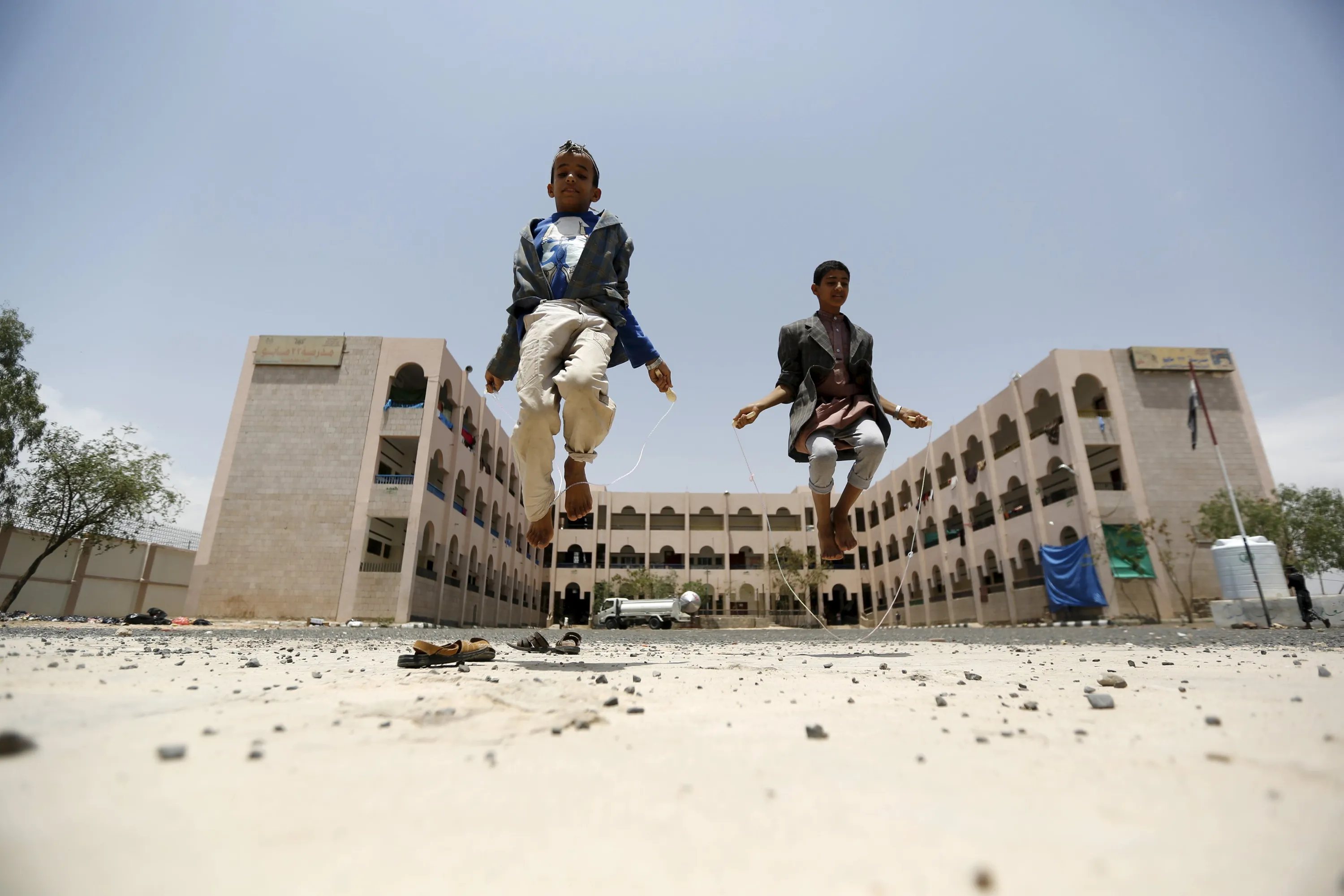Boys skip at a school in Yemen's capital Sanaa sheltering people after the conflict forced them to flee their areas from the Houthi-controlled northern province of Saada August 4, 2015. A Saudi-led Arab alliance launched a military campaign on March 26 to end Houthi control over much of Yemen and to return President Abd-Rabbu Mansour Hadi from exile. (Photo by Khaled Abdullah/Reuters)