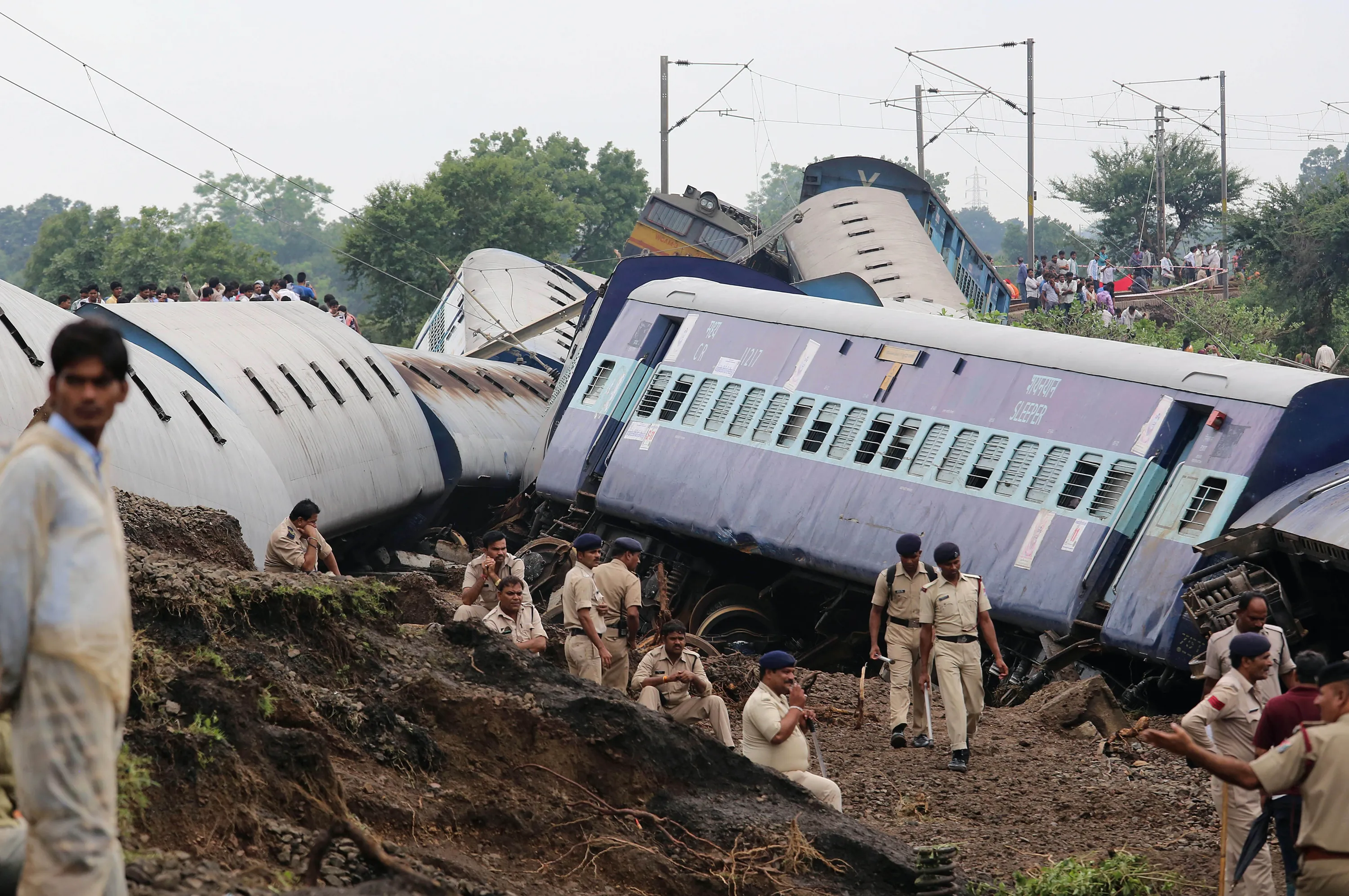 Indian policemen take a rest after rescue works at the site of a train accident at 180 kilometers from Bhopal near Harda district of Mahdya Pradesh, India 05 August 2015. (Photo by Sanjeev Gupta/EPA)