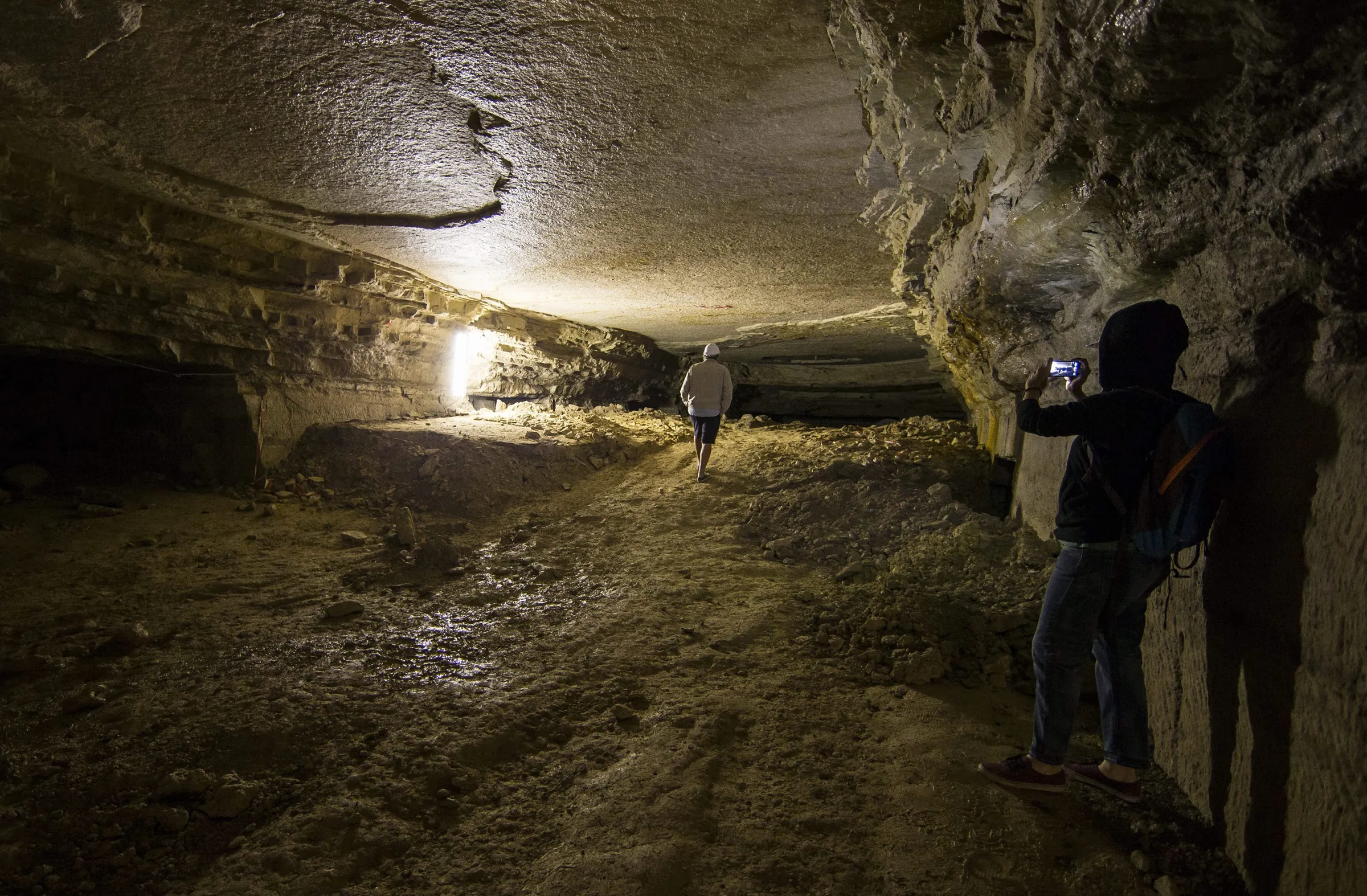 Visitors tour the depths of the Vincennes quarry during a press visit, near Paris, France, 05 August 2015. Located in the bois de Vincennes forest on the outskirts of Paris, the Vincennes quarry, active from the Middle Ages until 1860, provided the stone and limestone used for the construction and remodelling of the city of Paris as we know it today. After its closure, the quarry's dark and damp galleries were briefly used to grow mushrooms, known as “Champignons de Paris”. Since 2005, the city of Paris has launched renovation works to secure the vast stretches of underground galleries 20 meters below ground, in hopes to one day open them to the public. (Photo by Ian Langsdon/EPA)