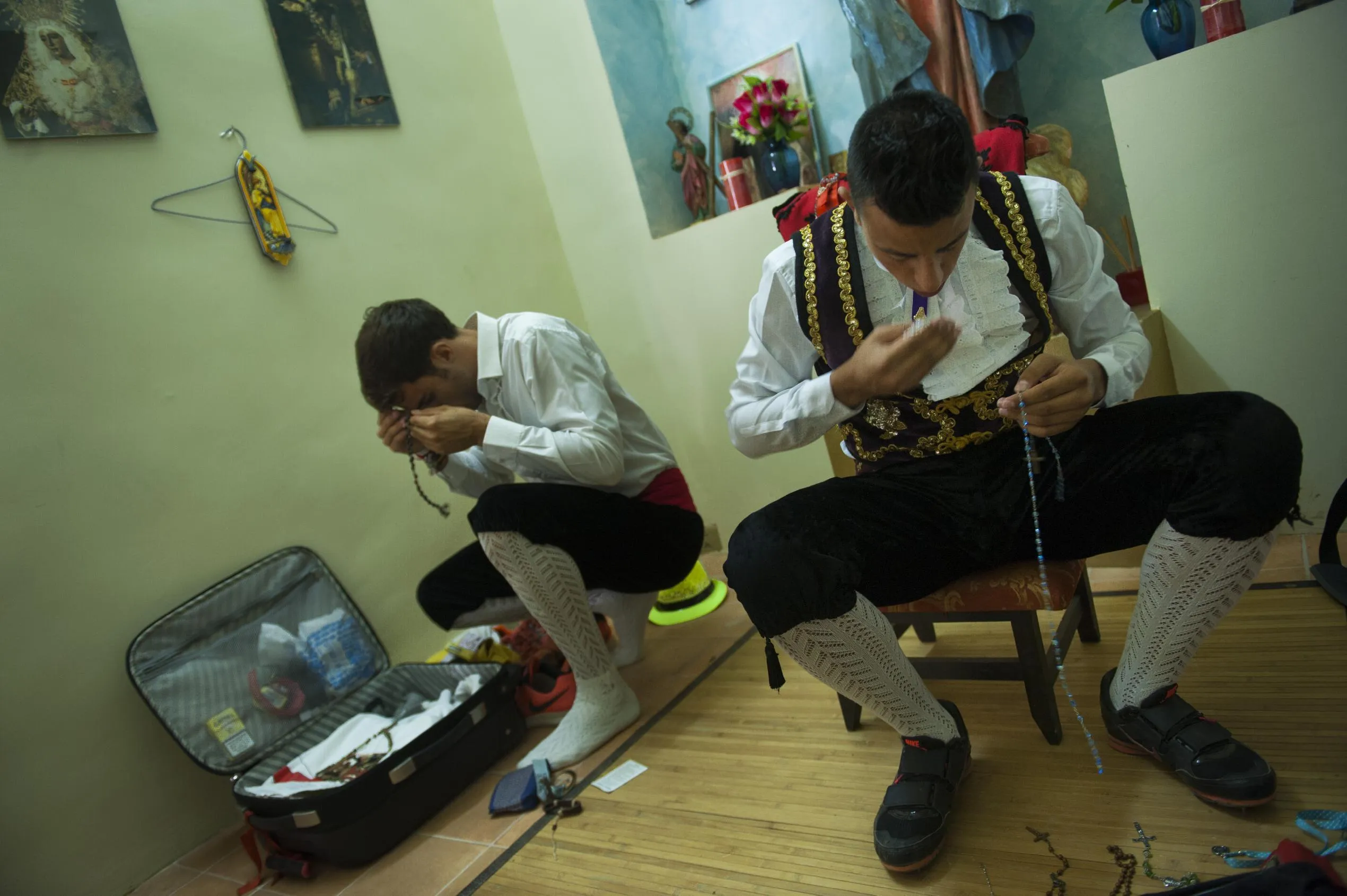 Paquito Miurillo, right, prays beside his colleagues before taking part in a “Corrida Goyesca” in Estella, northern Spain, Tuesday, August 4, 2015. (Photo by Alvaro Barrientos/AP Photo)