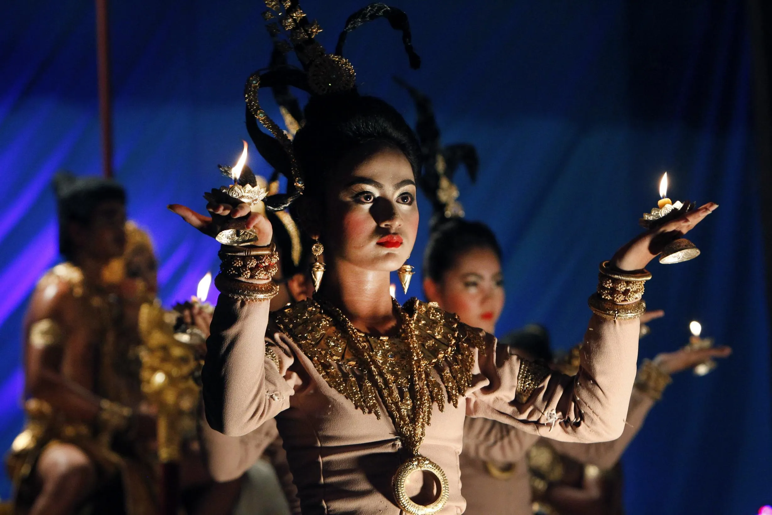 Cambodian Royal Fine Art University students perform the traditional drama, called “Lakhoan Yike” in Phnom Penh, Cambodia, Wednesday, August 5, 2015. The drama tells a historical narrative. (Photo by Heng Sinith/AP Photo)