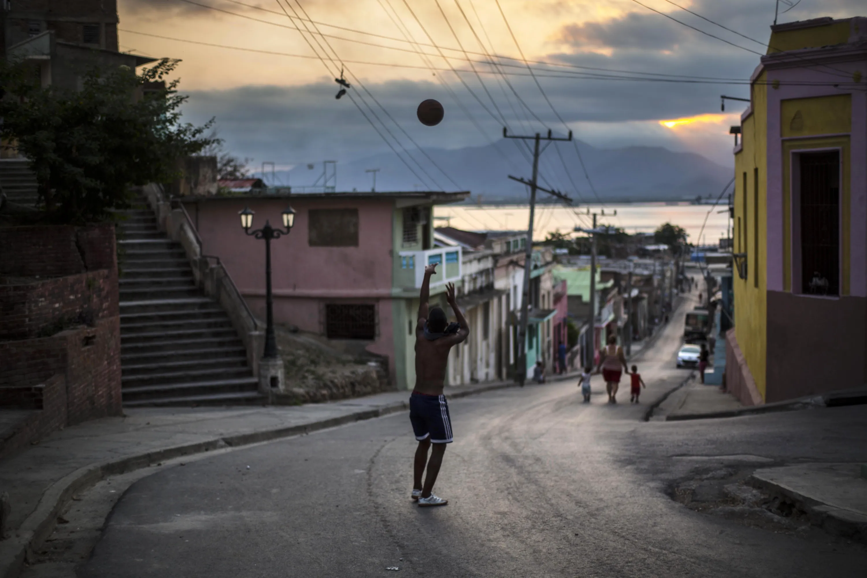 In this March 20, 2015 photo, a youth tosses a ball in a street that leads to the bay, in downtown Santiago, Cuba. (Photo by Ramon Espinosa/AP Photo)