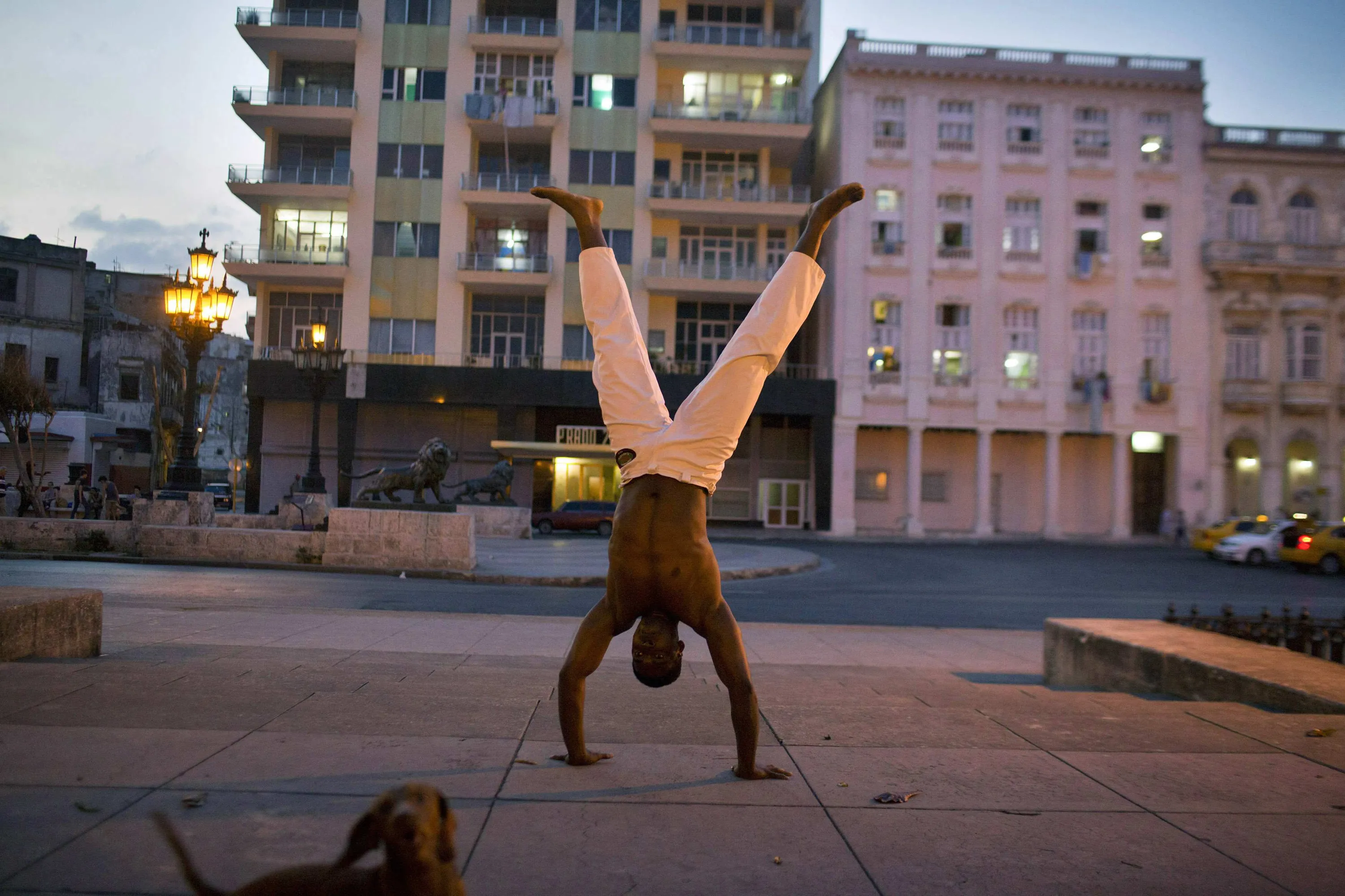 Capoeira teacher Eiwer Carbonell, 21, warms up before a lesson near his dog Champion, or Campeon in Spanish, playing around in downtown Havana February 4, 2015. (Photo by Alexandre Meneghini/Reuters)