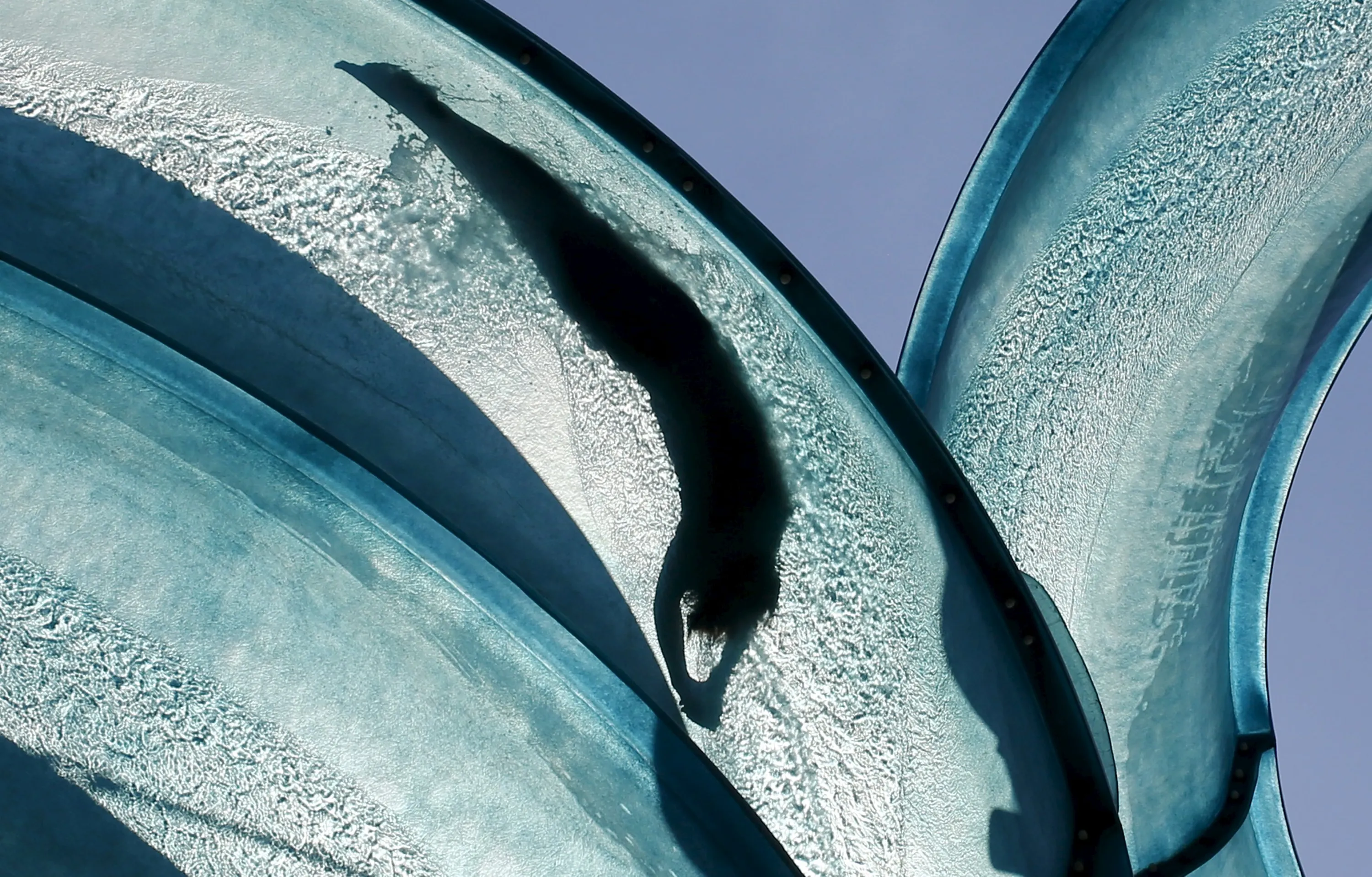 A visitor is silhouetted as she slides down a huge water pipe at a public swimming pool on a hot sunny day in Vienna, Austria, July 22, 2015. (Photo by Leonhard Foeger/Reuters)