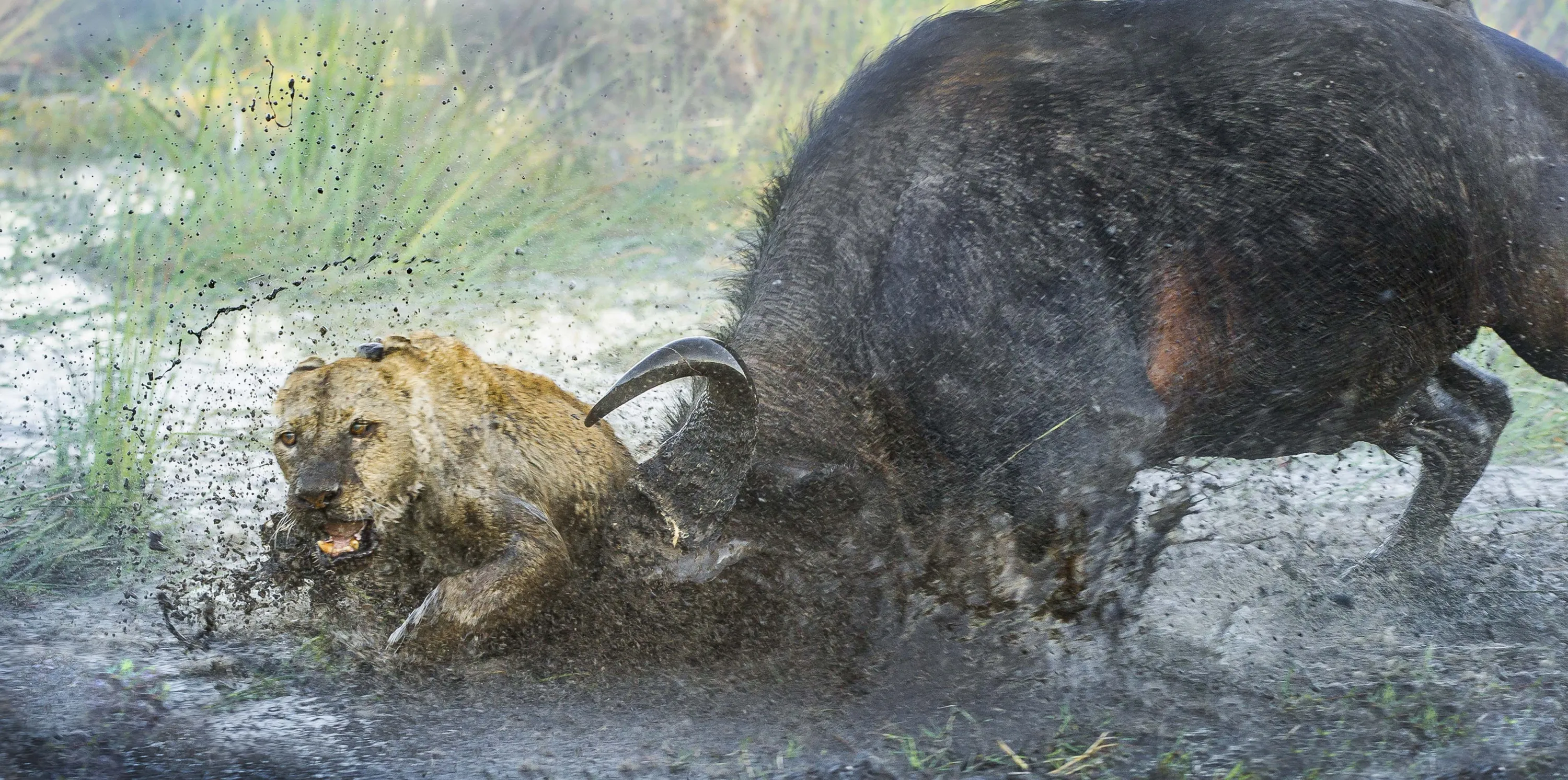 Lion in pursuit of bull being attacked. (Photo by Wim van den Heever/Caters News)