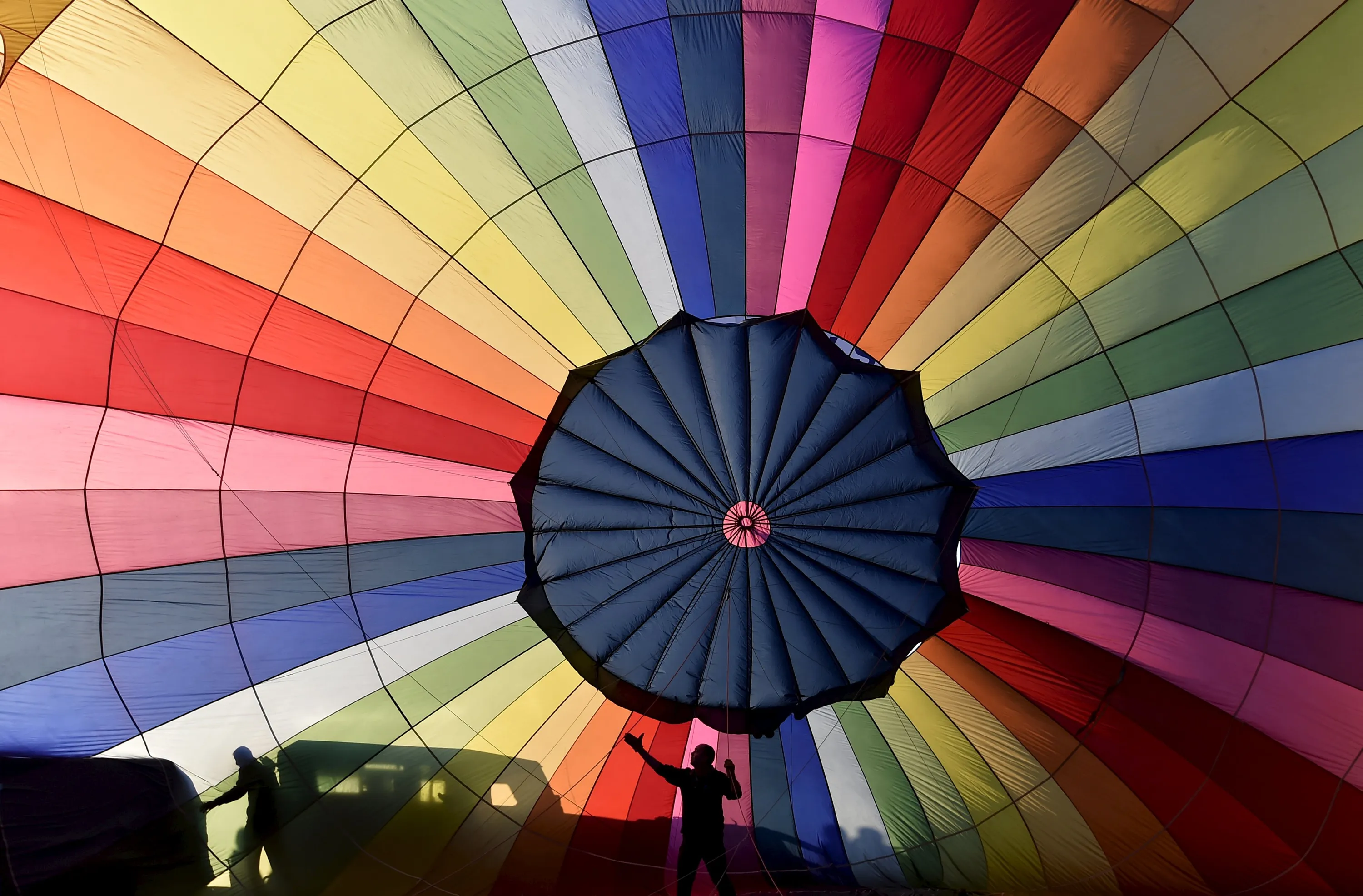 Crew members inflate a balloon during a mass launch at the Bristol International Balloon Fiesta in south west England August 7, 2015. (Photo by Toby Melville/Reuters)