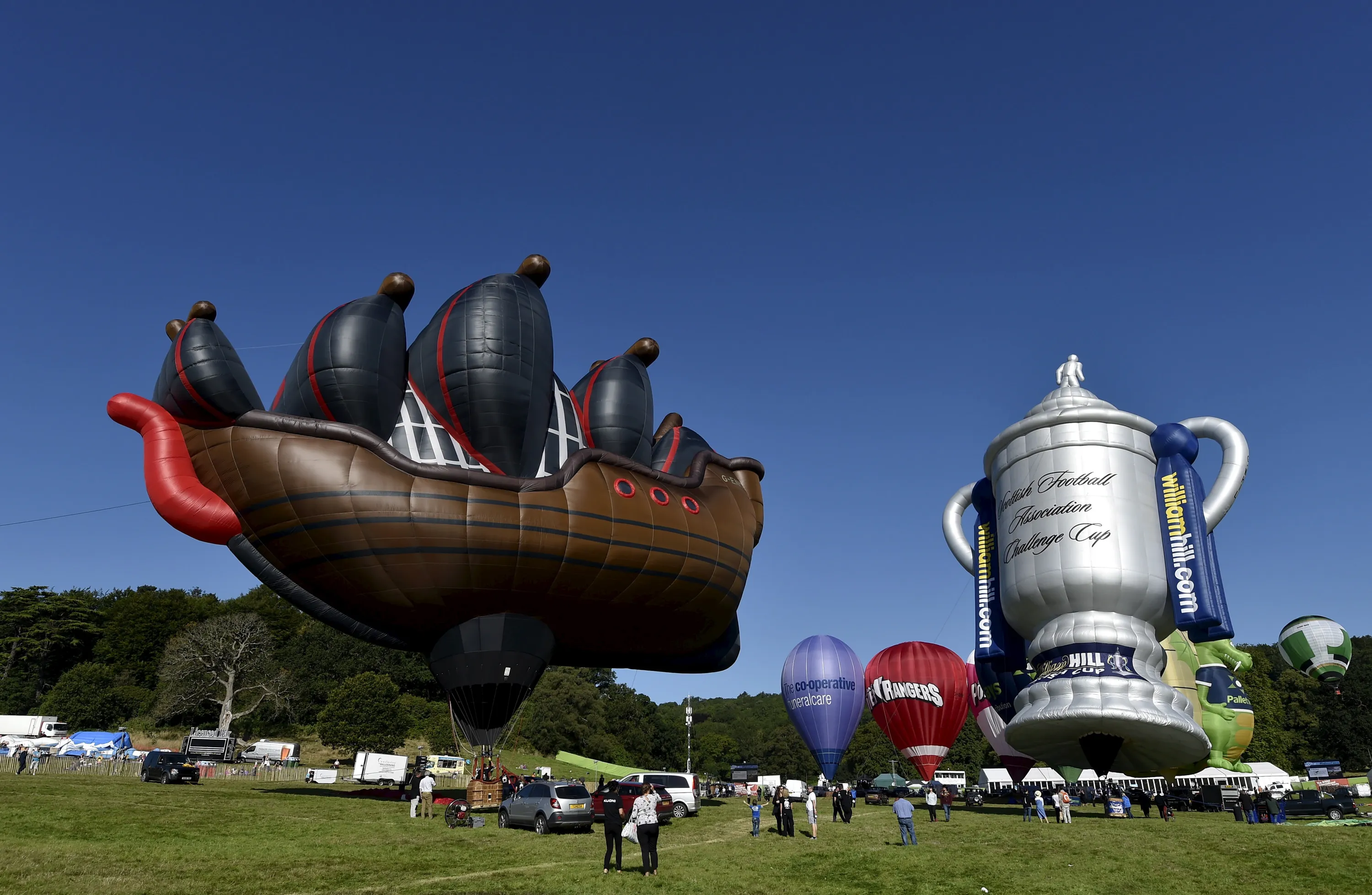 A hot air balloon named “The Ship” (L) is seen tethered during a mass launch at the Bristol International Balloon Fiesta in south west England August 7, 2015. (Photo by Toby Melville/Reuters)